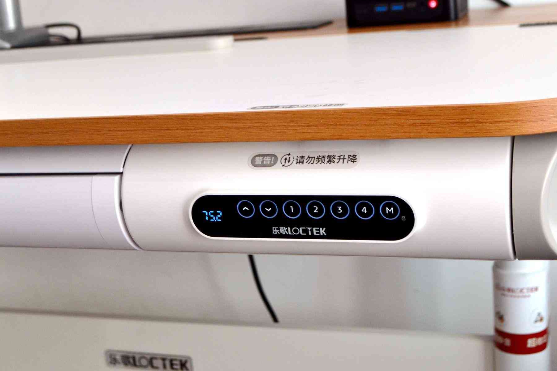 在桌子的右側(cè)邊緣設有一塊小小的LED屏,在屏幕右側(cè)設有7顆按鍵,左側(cè)的兩顆升降按鍵可以控制桌子的升降,通過升降鍵調(diào)節(jié)到合適的高度時,按一下最右側(cè)的M鍵,再按一下數(shù)字鍵,就可以保存當前的高度,樂歌EC7一共設有四個數(shù)字鍵,也就是說,我們可以預設四種不同的高度,剛好,可以把孩子的站立高度、坐姿的高度保存,以及我作為電腦桌用的站姿和坐姿高度保存。此外,M鍵還是童鎖鍵,長按M鍵就可以鎖定遙控了,以防止孩子誤觸,長按就可以完成解鎖。
