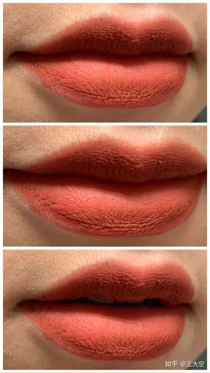 液體唇釉配的刷頭很小,是一根mini圓柱體。我是屬于手殘黨的,所以用起來感覺像是小孩兒學(xué)寫字,刷頭不大受控制。但畢竟刷頭小,所以造成的后果還尚屬有限。同樣因?yàn)樗㈩^小,不多涂幾次是無法均勻地給唇部上色的,不怎么方便。另外隨著上嘴時(shí)間增長,可能是水分蒸發(fā)了吧,她本身的粉末性狀開始凸顯,啞光得很美,跟某些啞光唇膏的海報(bào)一樣,但確實(shí)非常顯唇紋。