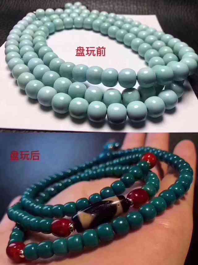 這種情況就簡單的多了,綠松石佩戴把玩過程中不斷接觸人體皮膚,人體分泌的油脂汗液慢慢侵染松石,不知不覺中會在松石表面形成一層保護(hù)膜,有效的防止松石過快失水,久而久之油脂汗液侵入松石內(nèi)部,松石顏色也會隨之變化。這是一個非常美妙的漸變過程。在盤玩變色過程中,也會有一段尷尬時期,開始變色,但未完全變色,這就是所謂的盤花了。出現(xiàn)尷尬期大家不用過于擔(dān)心,只要堅持盤下去,松石盤花的部位就會消失。