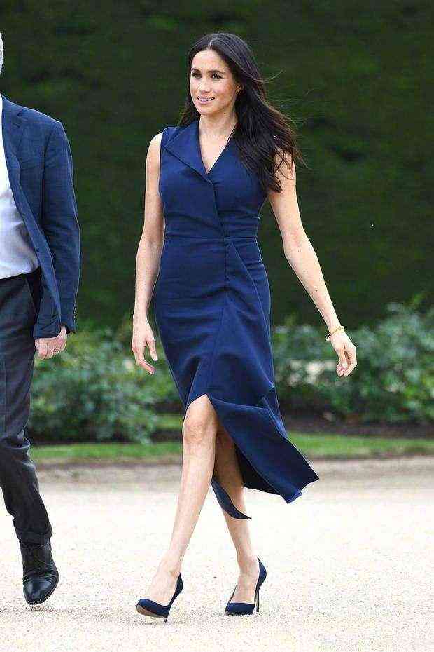 之前的梅根,穿過一款不規(guī)則翻領的寶石藍裙裝,簡單干練不挑人,很適合職場女性穿著。修身設計與不對稱剪裁很個性,前開叉設計走路帶風的同時還可秀美腿,再配雙高跟鞋氣場無人可及。