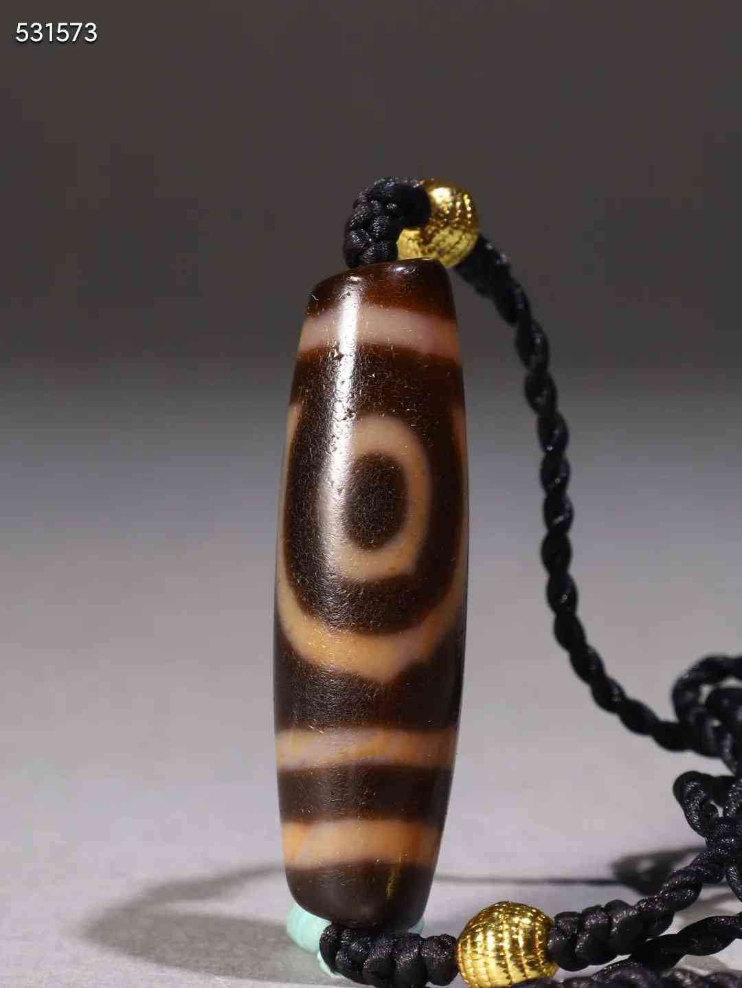 此天珠形體修長,兩色相間,其規(guī)整清晰,天河分割并有序排列。包漿潤澤,自然風化之痕跡明顯,穿孔老道,手感極佳。帶眼天珠為藏佛神圣之物,藏傳天珠靈氣巨大,令佩戴者財富日增,慈悲增長,權威顯赫,有離苦得樂之意,值得收藏。