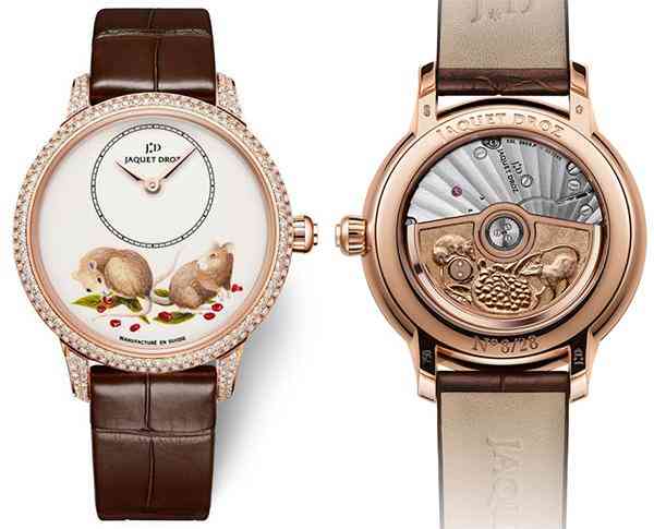 雅克德羅鼠年時(shí)分小針盤腕表采用微繪琺瑯工藝?yán)L制出靈鼠與石榴的美好景象。