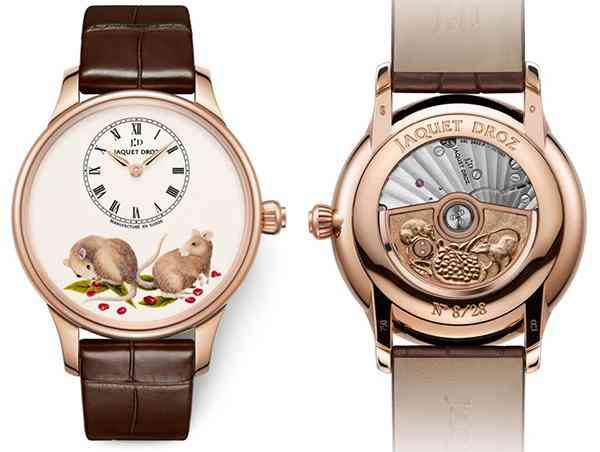 每款珠寶腕表的石榴果均以紅寶石雕琢而成,9點(diǎn)鐘位置的數(shù)個(gè)種衣采用雪花式鑲嵌,鼠爪則抱著一顆尺寸較大的紅寶石石榴籽。珍貴材質(zhì)的巧妙配搭(鉆石、金、紅寶石)突顯出老鼠的自然天性——熱情、雄心勃勃、富有創(chuàng)造力,象征著繁榮昌盛。兩款腕表遵循雅克德羅藝術(shù)作品限量發(fā)行的傳統(tǒng),僅限量發(fā)行8枚。