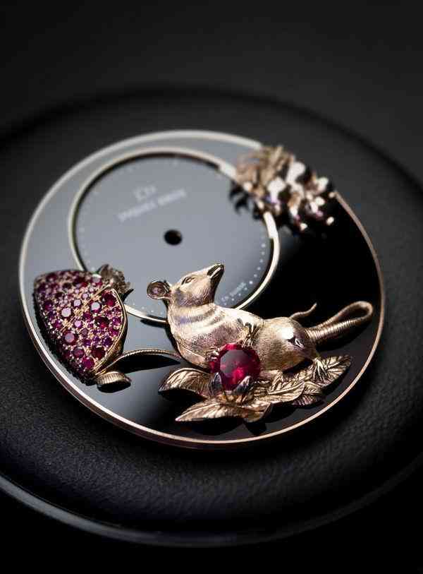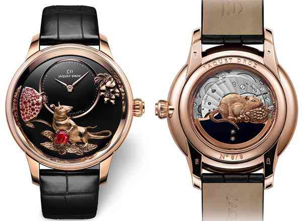 雅克德羅鼠年時(shí)分小針盤腕表采用精雕工藝?yán)w毫畢現(xiàn)地呈現(xiàn)靈鼠的形態(tài),更采用紅寶石來(lái)表現(xiàn)紅石榴的晶瑩剔透。