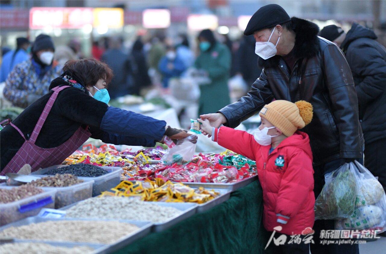 12月3日,市民在庫爾勒市友好街道博愛社區(qū)天山綠苑小區(qū)的惠居家生鮮便民市場選購食物。目前,庫爾勒市各商超供應充足,價格穩(wěn)定。確·胡熱 攝