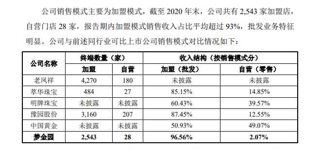 夢金園加盟店銷售收入占比遠(yuǎn)超同行。紅星資本局注意到,夢金園在招股書中承認(rèn)其批發(fā)業(yè)務(wù)特征明顯。夢金園稱,公司銷售模式主要為加盟模式,截至2020年末,公司共有2543家加盟店,自營門店28家,報(bào)告期內(nèi)加盟模式銷售收入占比平均超過9成。