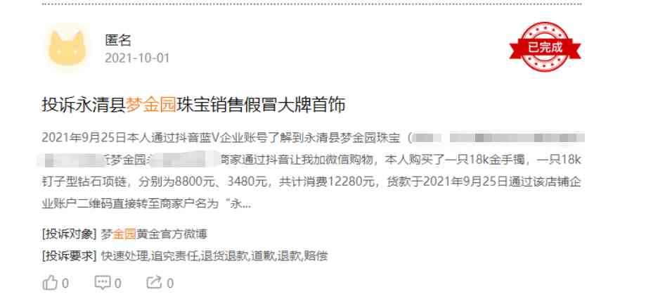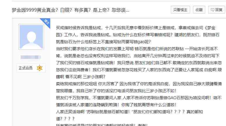 紅星資本局在黑貓投訴及貼吧發(fā)現(xiàn),消費(fèi)者投訴夢金園主要集中在產(chǎn)品質(zhì)量問題和宣傳誤導(dǎo)問題。有消費(fèi)者投訴多家夢金園店鋪存在售賣假冒珠寶手鏈情況,還有消費(fèi)者投訴購買的黃金飾品掉色嚴(yán)重。
