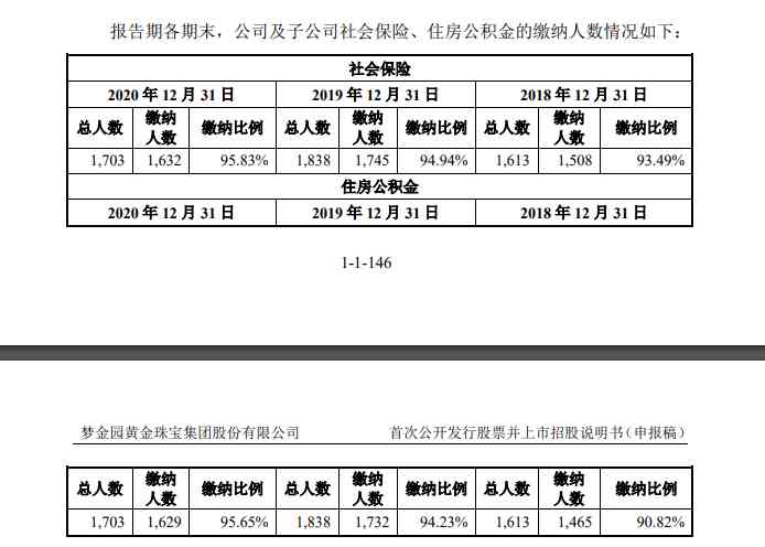 而在招股書中,夢金園稱,截至2020年12月31日,公司及子公司員工共計(jì)1703人,已繳納社會保險(xiǎn)人數(shù)為1632人,占員工總數(shù)的 95.83%;未繳納社會保險(xiǎn)人數(shù)為71人,占員工總數(shù)的4.17%;已繳納住房公積金人數(shù)為1629人,占員工總數(shù)的95.65%,未繳納住房公積金人數(shù)為74人,占員工總數(shù)的4.35%。