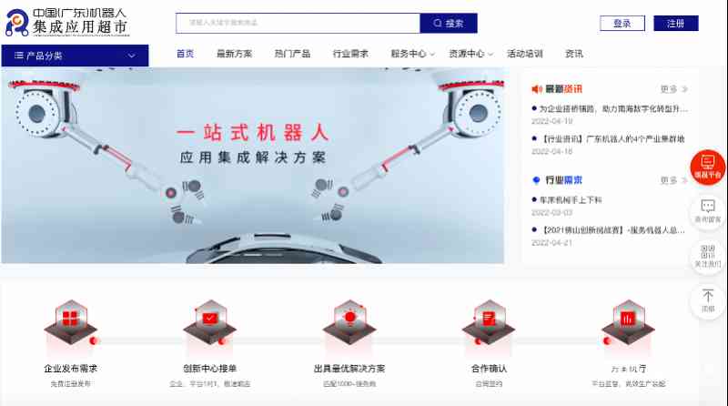 項(xiàng)目數(shù)字化管理、智能匹配分包/轉(zhuǎn)包、應(yīng)用案例大全……集成應(yīng)用超市的系統(tǒng)概念搭建起來(lái)。在集成應(yīng)用超市首頁(yè),“一站式機(jī)器人應(yīng)用集成解決方案”在主視覺(jué)處滾動(dòng),的機(jī)器人方案、熱門(mén)產(chǎn)品、行業(yè)需求以及服務(wù)中心、資源中心在首行可供瀏覽,它們面對(duì)的是佛山各大制造行業(yè)領(lǐng)域,多種類(lèi)機(jī)器人產(chǎn)品可供在此對(duì)接。從企業(yè)發(fā)布需求到創(chuàng)新中心接單,而后出具最優(yōu)解決方案,進(jìn)入確認(rèn)環(huán)節(jié)的即將上產(chǎn)線(xiàn)的“機(jī)器人們”也蓄勢(shì)待發(fā)。