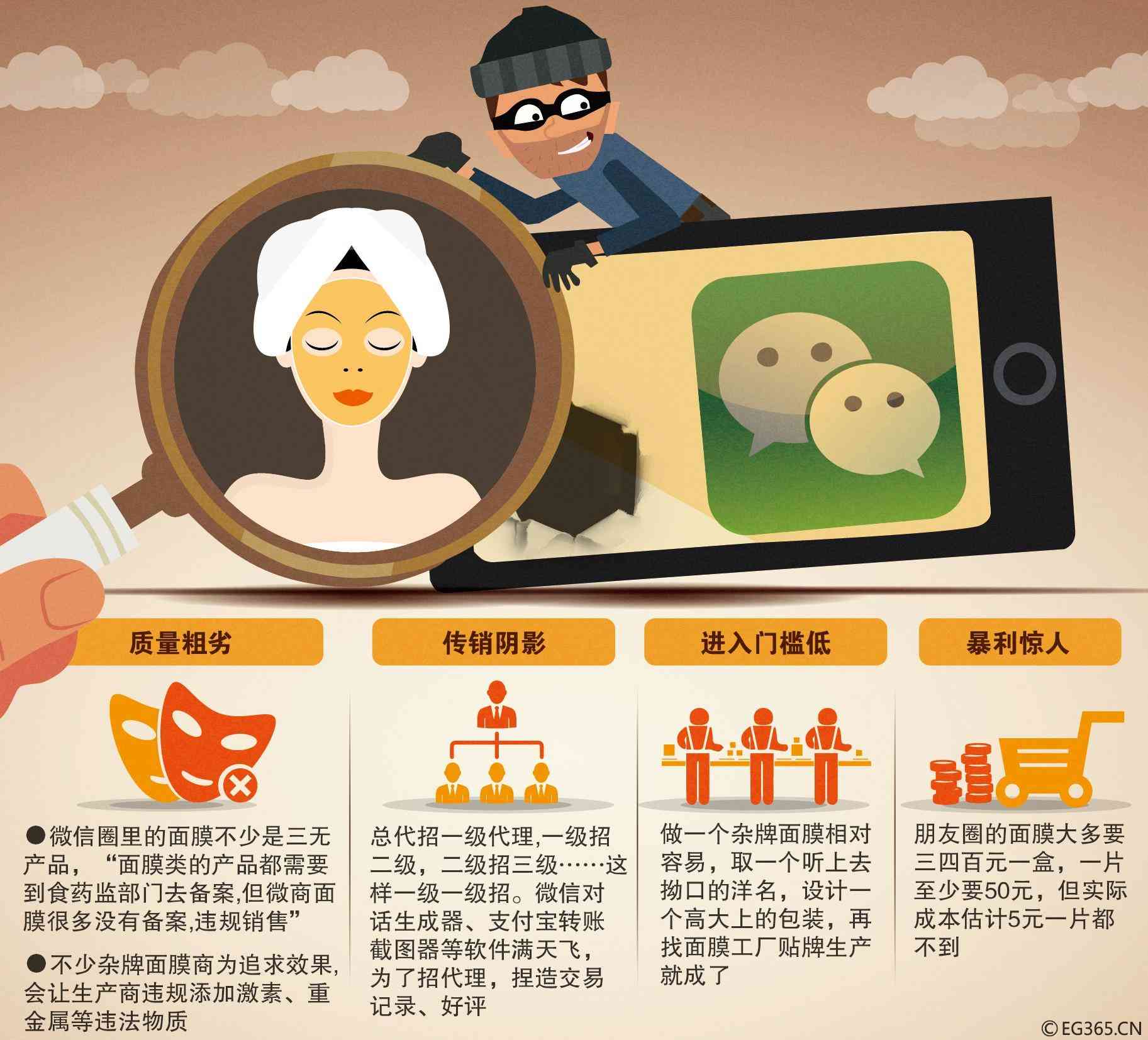90后朋友圈微商周夢晗此前被曝光留學(xué)回國后營造“網(wǎng)紅”身份,積累10萬粉絲并發(fā)展下線,自稱靠售賣面膜收入近8位數(shù)。而她的“三無”面膜卻讓一些賣家差點毀了容。