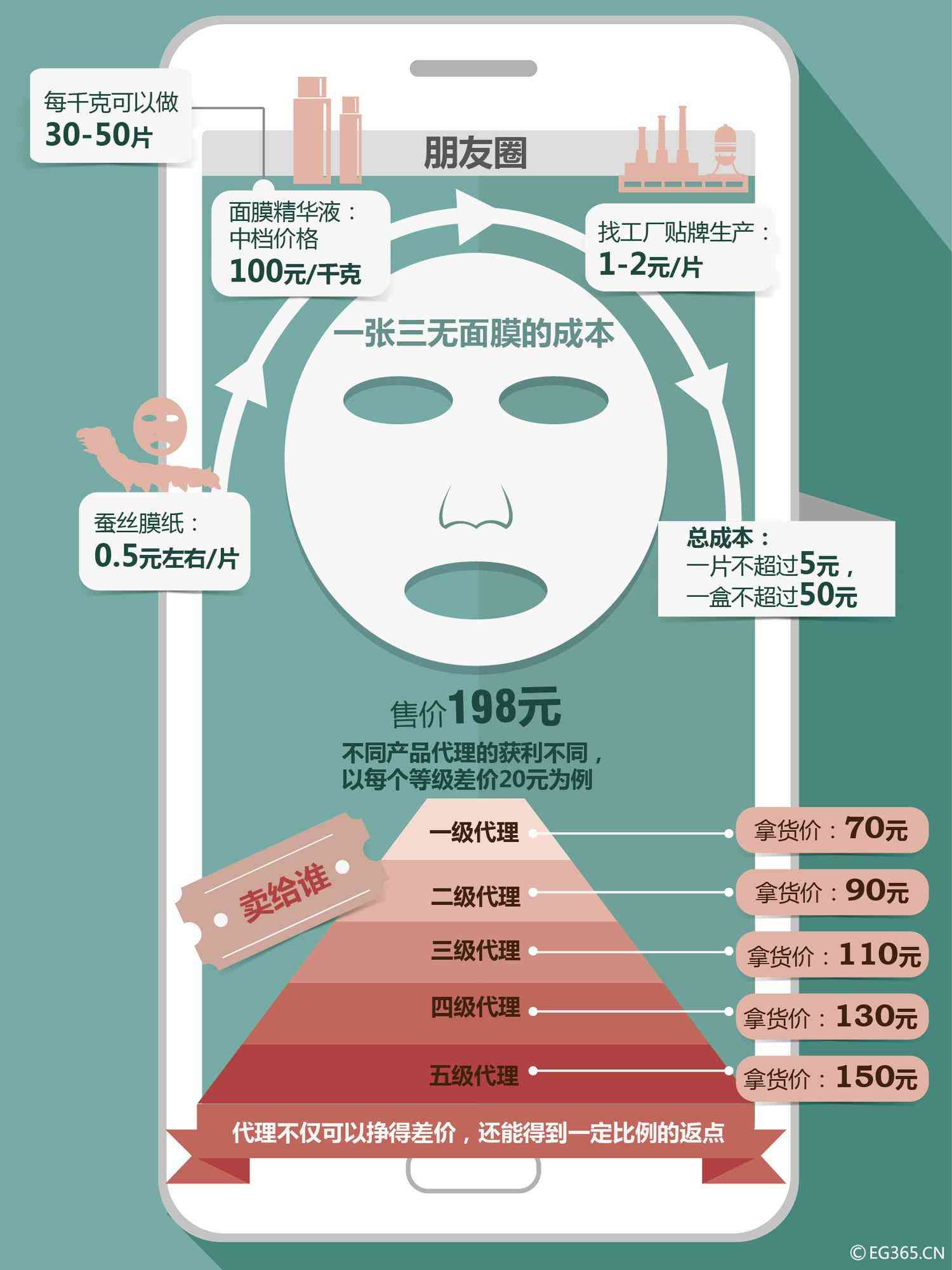 粗略計算,從一無所有到拿到自創(chuàng)國際品牌的面膜產(chǎn)品,僅需兩個月。如果以1萬張的生產(chǎn)量計算,各類費用平均到每張面膜大約為2.5元左右,而產(chǎn)量越大,對固定成本的稀釋也就越多,如果再選擇加工成本更便宜的成品,單片成本可以輕松降低到2元以下。