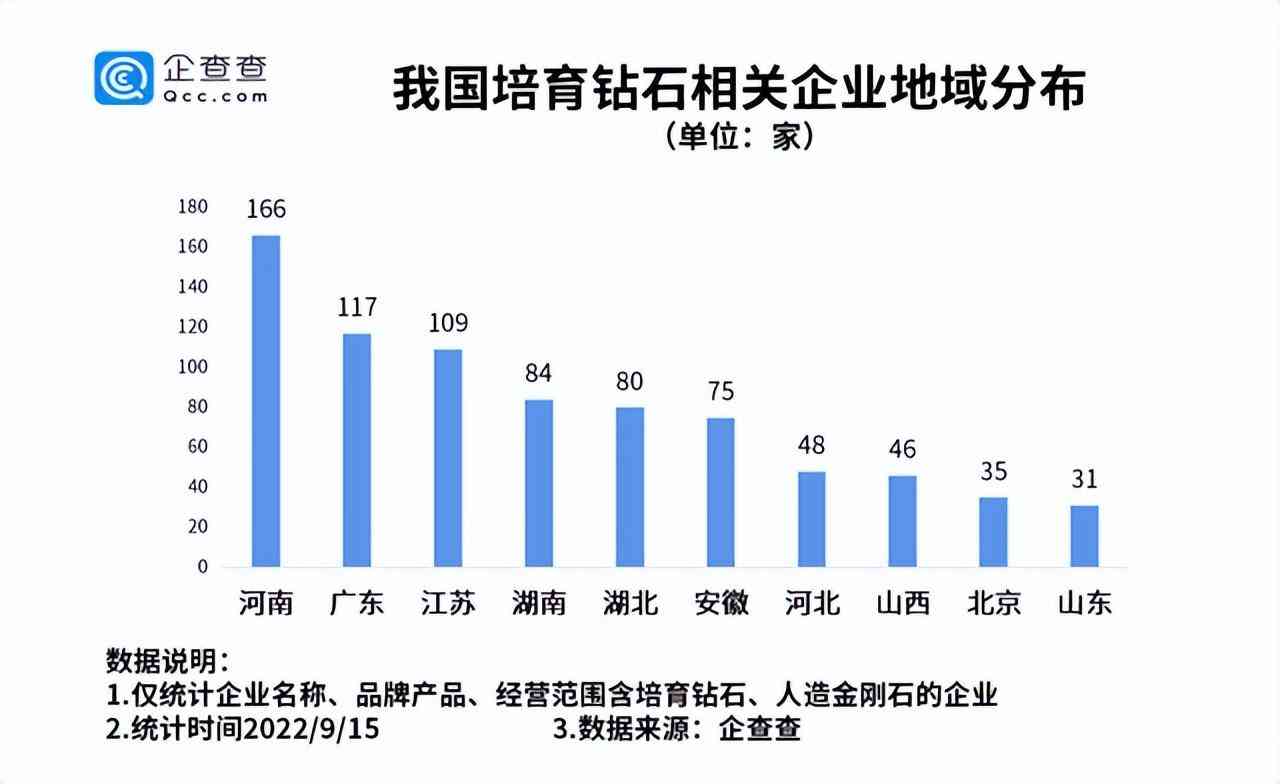 據(jù)企查查統(tǒng)計(jì),按照企業(yè)名稱、品牌產(chǎn)品、經(jīng)營(yíng)范圍包含培育鉆石、人造金剛石篩選后按照地域排名,河南相關(guān)企業(yè)有166家,比第二名廣東多了49家。
