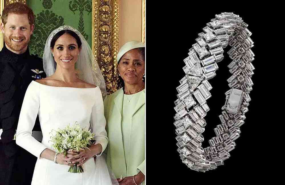 在梅根和哈里的婚禮上,他深情地握著她的手,每個人都注意到了那個漂亮的鉆石手鏈,它來自卡地亞的 Reflection 系列,就像她在招待會上戴的耳環(huán)一樣,價值約為 155,000 美元。