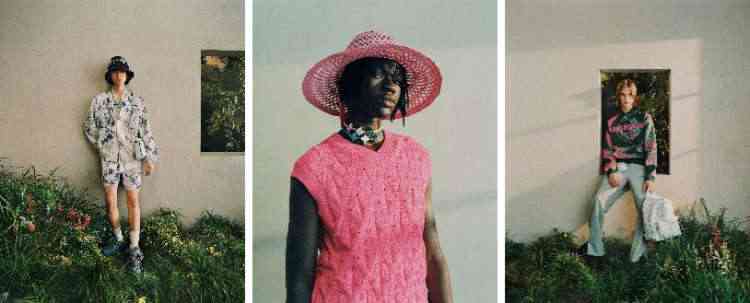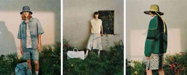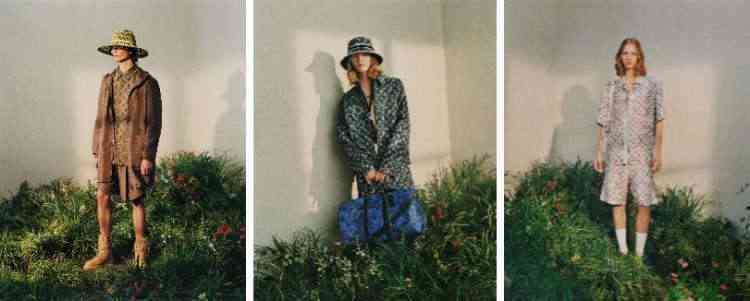 在本系列的第二篇章中,綠洲式的豐茂景色與烈日炎炎的沙丘形成強(qiáng)烈對(duì)比。陸地與水生植物主題元素被引入輕便簡(jiǎn)約的休閑旅行時(shí)裝設(shè)計(jì)。一款常青藤印花的教練夾克采用輕質(zhì)結(jié)構(gòu),布滿logo的刺繡棒球外套采用鏤孔設(shè)計(jì),強(qiáng)化透氣性,而由皮革與尼龍制成的雙面飛行員夾克,可適應(yīng)不同天氣與場(chǎng)合。一款皮革襯衫與短褲套裝飾有漩渦形鏤紋,猶如一串串流動(dòng)的氣泡。全新的點(diǎn)彩畫(huà)法Monogram圖案 – 模仿印象派繪畫(huà)技法 – 呈現(xiàn)出水下游動(dòng)的模糊觀感。此種圖案被印于絲綢縐紗短褲與襯衫、針織衫,以及一款提花飛行員夾克與一套做舊牛仔裝。類似的花紋也出現(xiàn)在一款版型寬松、鑲有亮片及海藻圖案logo的背心上、及一款襯衫中,還有一款靛藍(lán)牛仔布工裝襯衫的Monogram壓紋呈現(xiàn)水蝕般的斑痕,以及多款充滿水下質(zhì)感的透明印花襯衫。采用同款府綢襯衫與游泳短褲相搭配的綢緞夾克飾有3D水下景觀圖案與logo元素,并點(diǎn)綴液體質(zhì)感的亮片??商娲菖菁喌奶峄椢锉桓脑鞛槌p材質(zhì)的形式,用于一款卡其布短褲以及多款印有迷你Monogram圖案的襯衫與短褲。