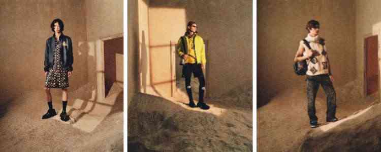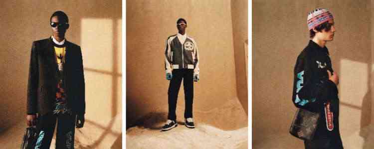 標(biāo)志性的路易威登元素經(jīng)過(guò)特殊處理,仿佛在沙漠中歷經(jīng)磨練。絨面皮革襯衫上的壓印Monogram呈現(xiàn)沙礫般的質(zhì)感。真絲與府綢襯衫上飾有沾滿沙塵的LV logo標(biāo)志。牛仔裝中的Monogram圖案似乎因沙漠烈日的炙烤而褪色。精裁夾克、飛行員夾克、連帽衫與針織衫均印有錯(cuò)視皺紙紋理,如同空中俯拍沙丘時(shí)呈現(xiàn)的細(xì)密溝壑。在2022年6月的路易威登男裝秀上首度亮相的Speaker Man造型變?yōu)楸鞠盗械膭?dòng)畫(huà)吉祥物,以提花束腰夾克的形式演繹并且作為印花出現(xiàn)在絲綢混紡襯衫上。