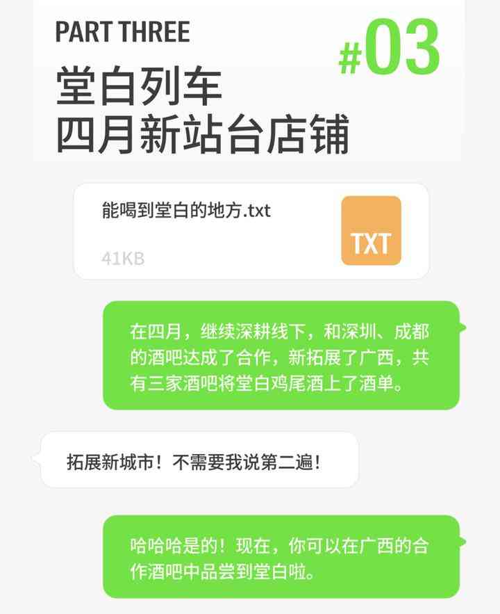 新酒飲品牌堂白不僅在積極地和深圳、成都、廣西酒吧一同合作推出使用堂白酒為基酒的雞尾酒,還在線上積極地教大家如何用自己的產(chǎn)品調(diào)制一杯口感有較大差異的雞尾酒,只愿你愛屋及烏,愛上白酒。