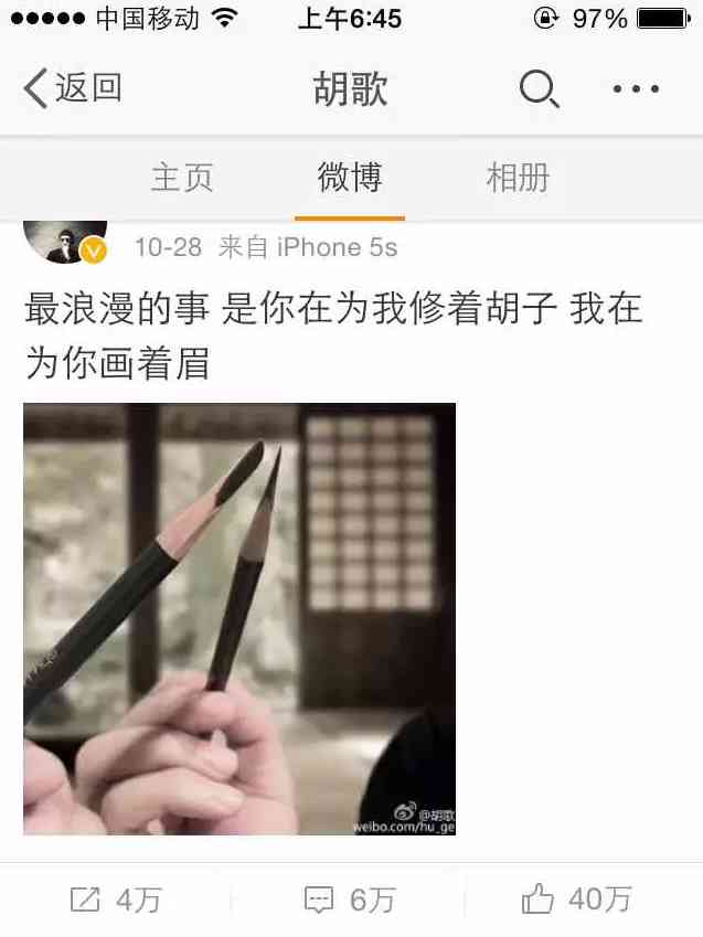 還有上個(gè)星期胡歌發(fā)了一條微博,后來阿嬌又發(fā)了一條,圖片里眉筆是同一支,一大波網(wǎng)友以為胡歌和阿嬌有啥情況。