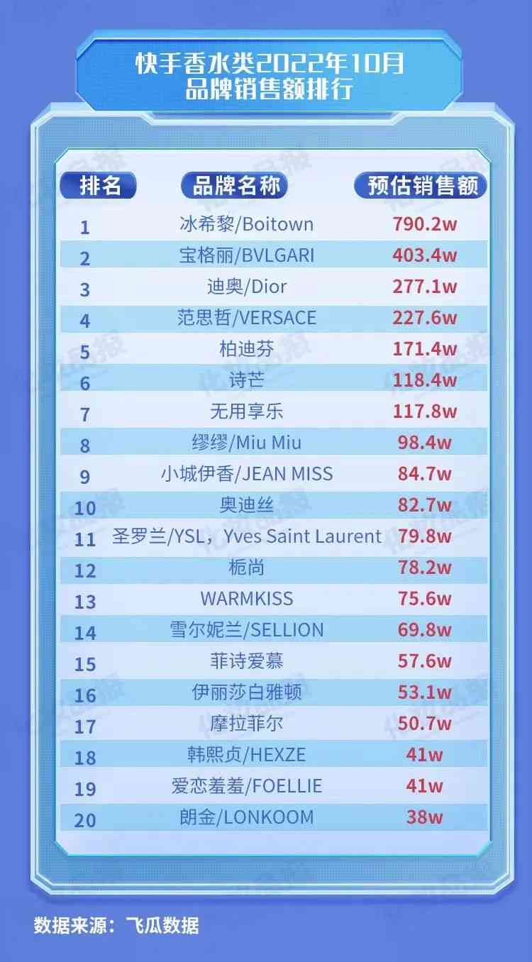 從快手香水類品牌銷售額來看,快手站內(nèi)品牌占絕大份額,國貨冰希黎以預(yù)估銷售額790.2萬元遙遙領(lǐng)先。寶格麗、迪奧、范思哲和柏迪芬躋身前五,分別并列第2-5名。國產(chǎn)20-100元以內(nèi)的香水,香味以國際大牌為參照的仿替平,備受快手消費(fèi)群喜愛。
