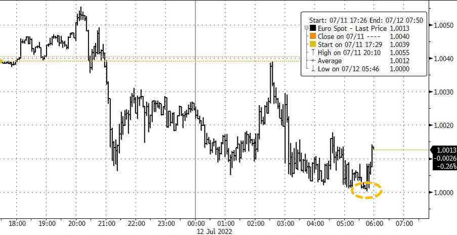 北京時間7月12日17時許 , 歐元兌美元一度觸及甚至跌破平價(即1歐元兌1美元),該貨幣對日內最低摸到0.99999。上一回見到這種情況,還要追溯到2002年的12月。