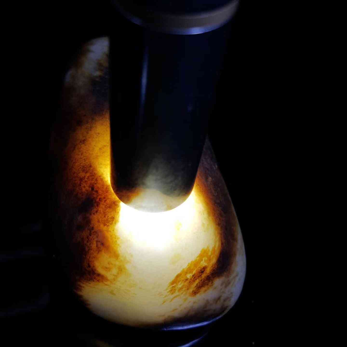 和田玉的細(xì)膩度取決于籽料形成時(shí)的玉化程度,玉化得好,細(xì)度就好;玉化不好,顆粒就會(huì)粗,肉眼或燈下能看到明顯的結(jié)構(gòu),甚至?xí)霭谆c(diǎn)。這些結(jié)構(gòu)特征一般在自然光下是很難看清楚的,這也就是我們所要說的,和田玉一定要打燈看的部分,也就是和田玉的結(jié)構(gòu)!