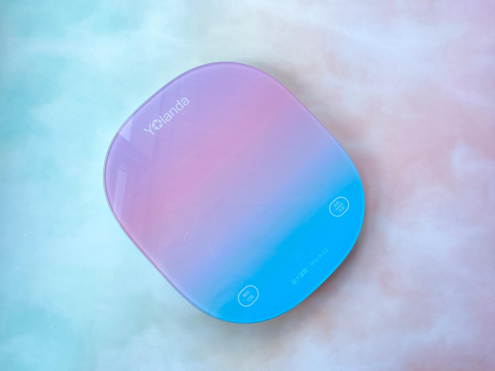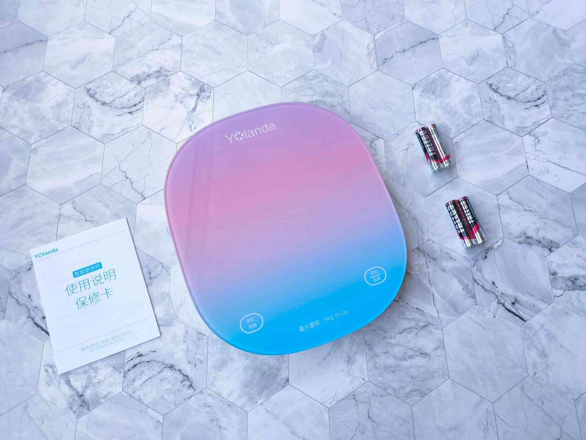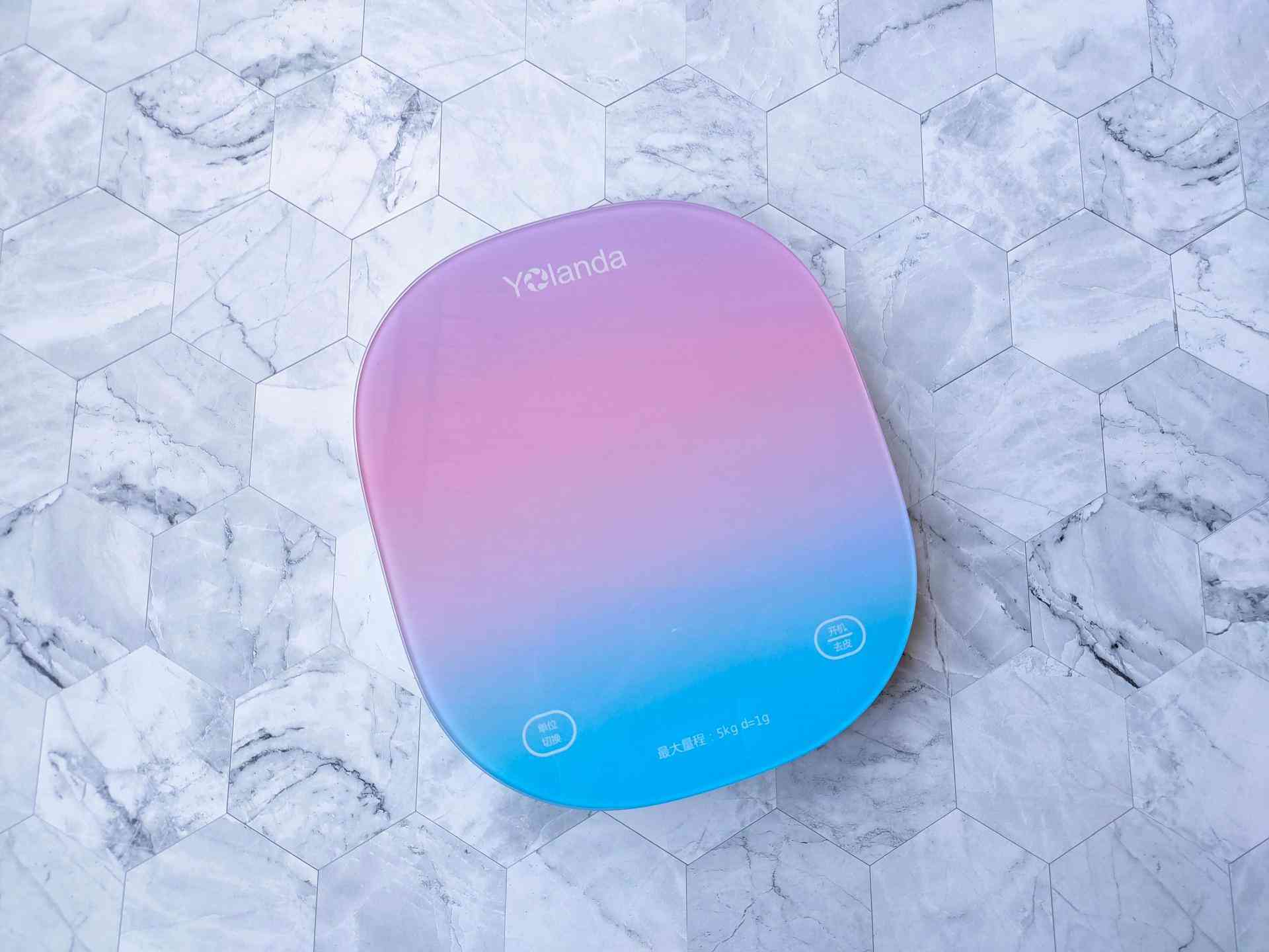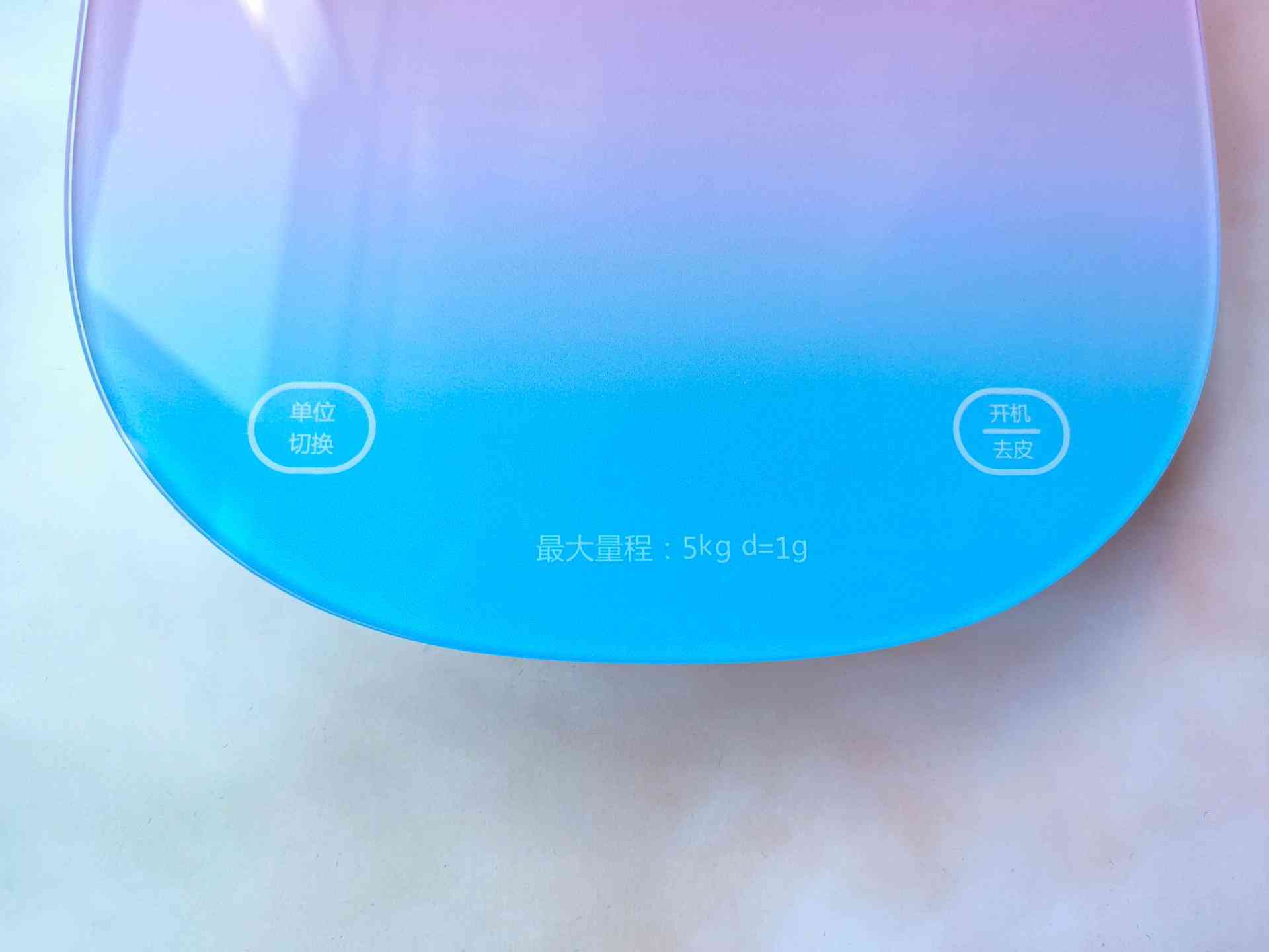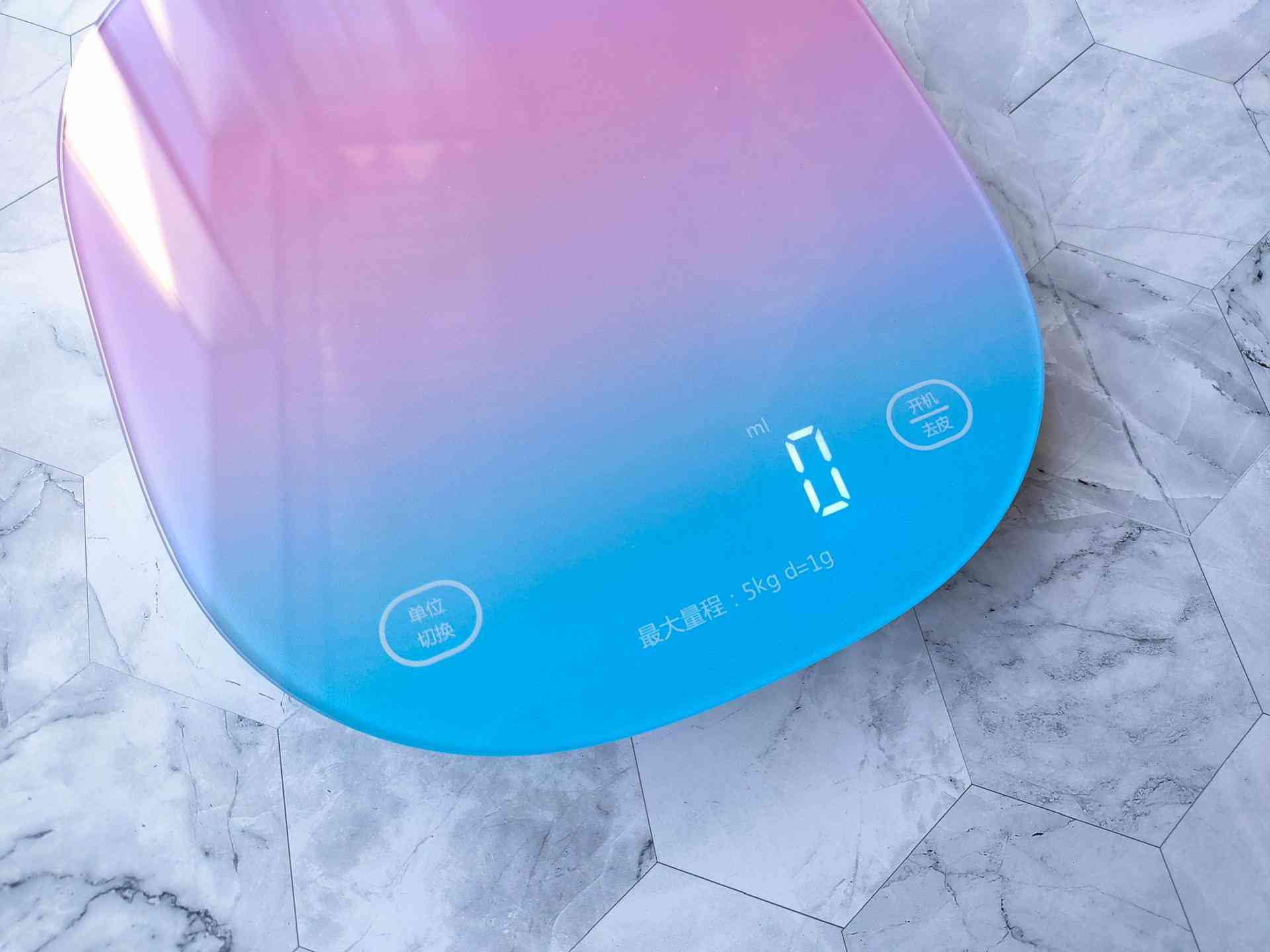 廚房秤這紅藍(lán)cp的漸變配色屬實(shí)漂亮,看著就很賞心悅目。全玻璃的表面,尤其是這種純平面的,清理起來也是異常方便,不論是掉上奶粉還是黃油又或者別的什么東東,都是一擦就干凈了。