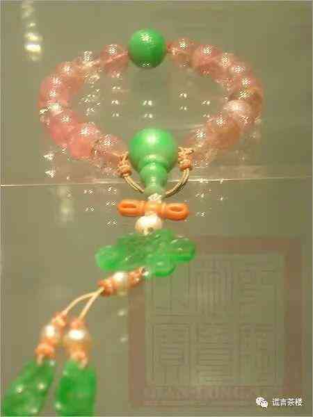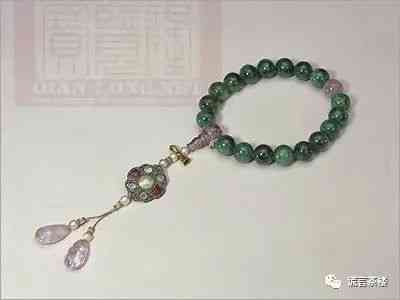 如圖慈禧生活用品之翡翠手串,由十八顆翡翠珠和兩顆碧璽珠穿成,與碧璽佛頭相連,下穿鉆石、紅寶石、珍珠、結(jié)牌等飾物。手串可以戴在手腕上,也可以掛在衣襟紐扣上。