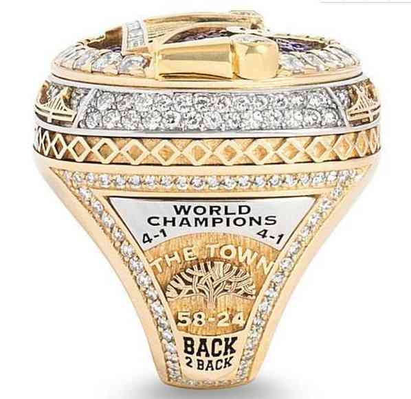 勇士在四年內(nèi)三次奪得總冠軍,與以往不同的是今年的總冠軍戒指暗藏了玄機,戒面是可以翻轉(zhuǎn)的,一面是74顆藍寶石打造,另一面則是鑲嵌了74顆亮白色的鉆石,代表著勇士常規(guī)賽+季后賽的總戰(zhàn)績,還有兩枚分別代表冠軍獎杯和奧克蘭海灣大橋的黃金和鉆石,戒指翻面打開則會看到勇士隊口號”眾志成城“以及側(cè)面象征奧克蘭的”The Town”圖案,戒指上還刻有上賽季常規(guī)賽58勝24負的戰(zhàn)績和季后賽四輪系列賽戰(zhàn)績(4-1,4-1,4-3,4-0),”back 2 back“則表示這是勇士隊連續(xù)第二年獲得(背靠背)總冠軍戒指,隊名一側(cè)鑲嵌有56顆鉆石,象征勇士在灣區(qū)度過的56個賽季。