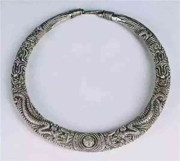 【項圈】頸飾是原始社會就很普遍的裝飾,春秋戰(zhàn)國時代的頸飾出土不少,河南三門峽上村嶺虢國墓地出土頸飾,其中一件系由許多不同形狀的〓組成,其余為〓形器及一小系璧。