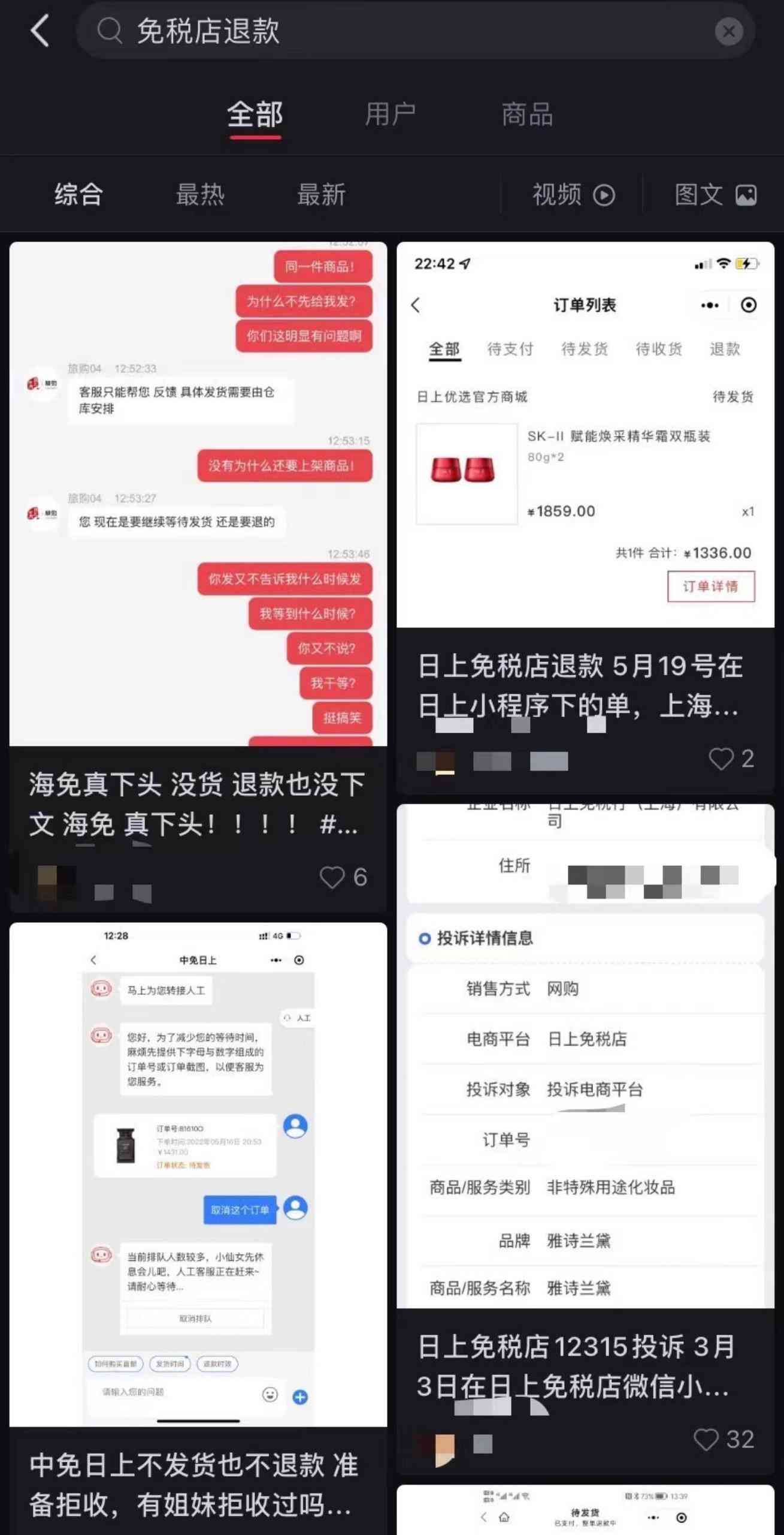 在小紅書平臺(tái)控訴免稅店退貨退款難的帖子不在少數(shù),以“免稅店退款”為關(guān)鍵詞搜索可以得到1900+篇筆記,以“免稅店退貨”為關(guān)鍵詞可以得到2300+篇筆記。貝殼財(cái)經(jīng)記者發(fā)現(xiàn),相關(guān)控訴帖子對(duì)象多為“cdf會(huì)員購(gòu)海南”和“中免日上”兩個(gè)小程序,控訴主要包括“未發(fā)貨無(wú)法退貨”“聯(lián)系售后客服困難”“被客服拒絕無(wú)理由退貨退款”“退貨信息不透明”“退貨成功后退款周期長(zhǎng)”等內(nèi)容。