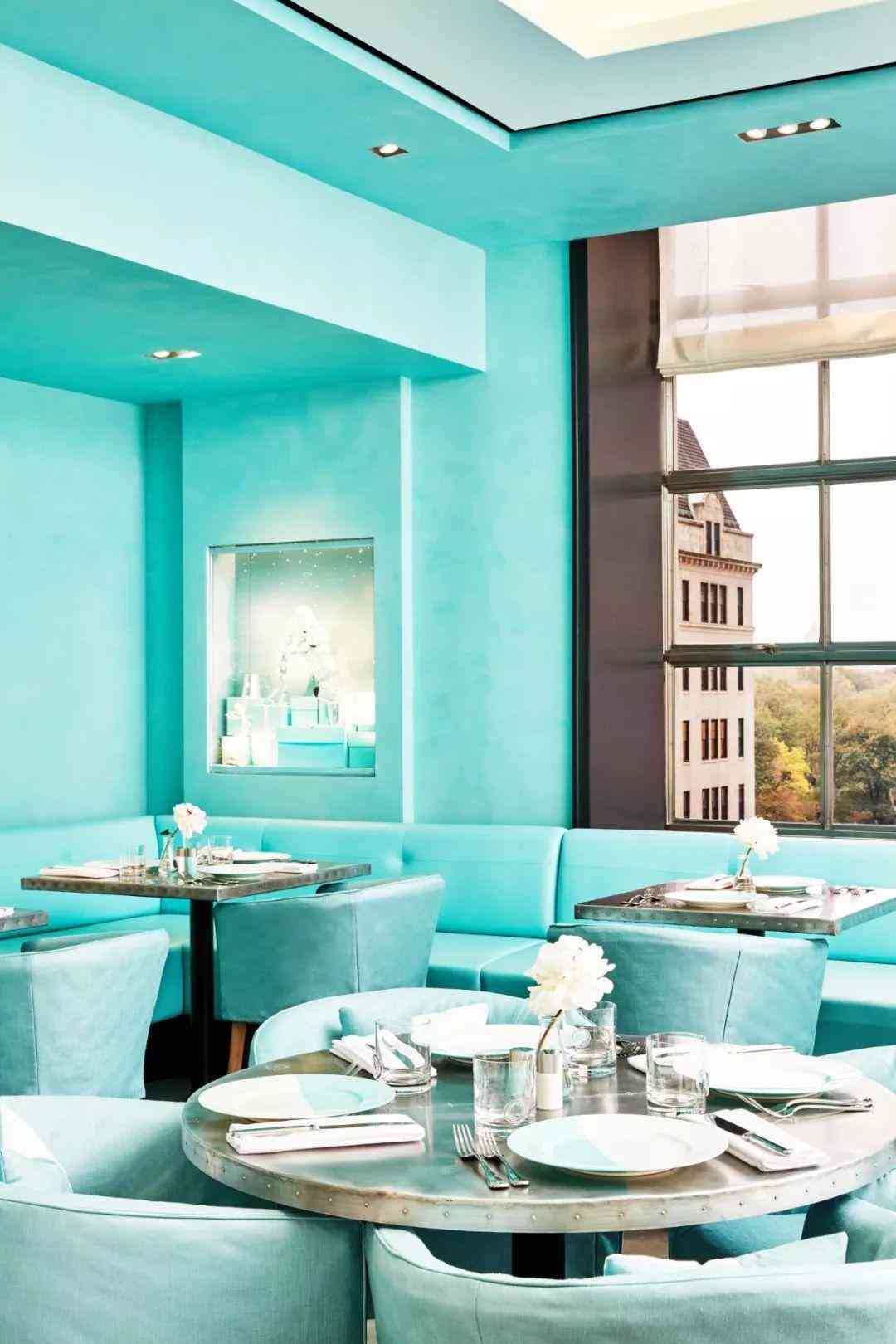位于蒂芙專柜的“藍(lán)盒子咖啡”(The Blue Box Café),桌面擺放蒂芙尼銀制餐具