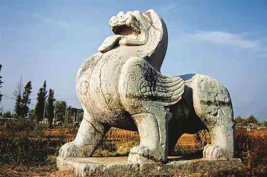 這種長犄角帶翅膀的神獸“天祿”和“辟邪”,還真不是何大師杜撰出來的,從漢代開始就有了。漢代由于張騫通西域,我國和西域地區(qū)有了深入的文化交流,西方流行的帶翼神獸“格里芬”、獅子等形象也跟著傳入我國,結(jié)合我們自己的一些傳說,產(chǎn)生了很多新的神獸,其中就有天祿和辟邪。一般認(rèn)為天祿和辟邪都是帶翅膀的有角獸,獨(dú)角的叫天祿,雙角的叫辟邪,它們還有個(gè)統(tǒng)稱叫“桃拔”或“符拔”。如孟康對(duì)《漢書》所做的注釋:“桃拔一名符拔,似鹿(實(shí)際上并不像鹿,更像獅子老虎),長尾,一角者或?yàn)樘炻?,兩角或?yàn)楸傩??!边@里說的是“或?yàn)椤保杂袝r(shí)候也不是嚴(yán)格按照獨(dú)角和雙角來區(qū)分。其實(shí)我們幾千年的歷史中,在沒有照片、網(wǎng)絡(luò)等技術(shù)手段的情況下,這種名和物的對(duì)應(yīng)很難做到完全一致,常常是非?;靵y的。自然界真實(shí)存在的動(dòng)植物,還不一定都能認(rèn)得那么準(zhǔn)呢,更何況是傳說中的神獸呢。有點(diǎn)扯遠(yuǎn)了,總之神獸體系中確實(shí)存在天祿和辟邪,后來這兩位常常被放在帝王的陵墓前,還是比較常見的。