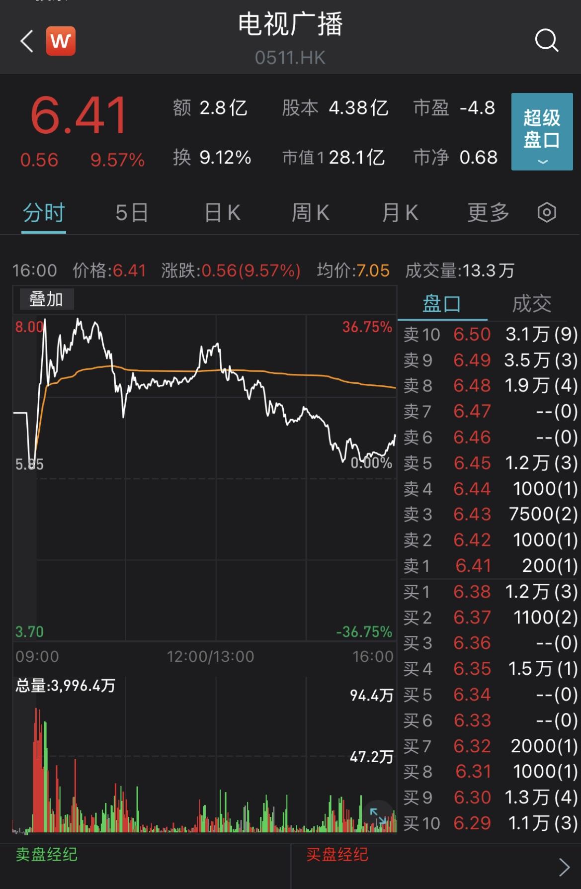 受上述消息影響,TVB上周五股價(jià)大漲超過(guò)51%。3月6日,TVB一度盤中漲超36%,觸及近一年股價(jià)高點(diǎn)。截至收盤,該股上漲9.57%,報(bào)收6.41港元。兩個(gè)交易日內(nèi)累計(jì)漲幅達(dá)66.06%,刷新短期累計(jì)漲幅紀(jì)錄。