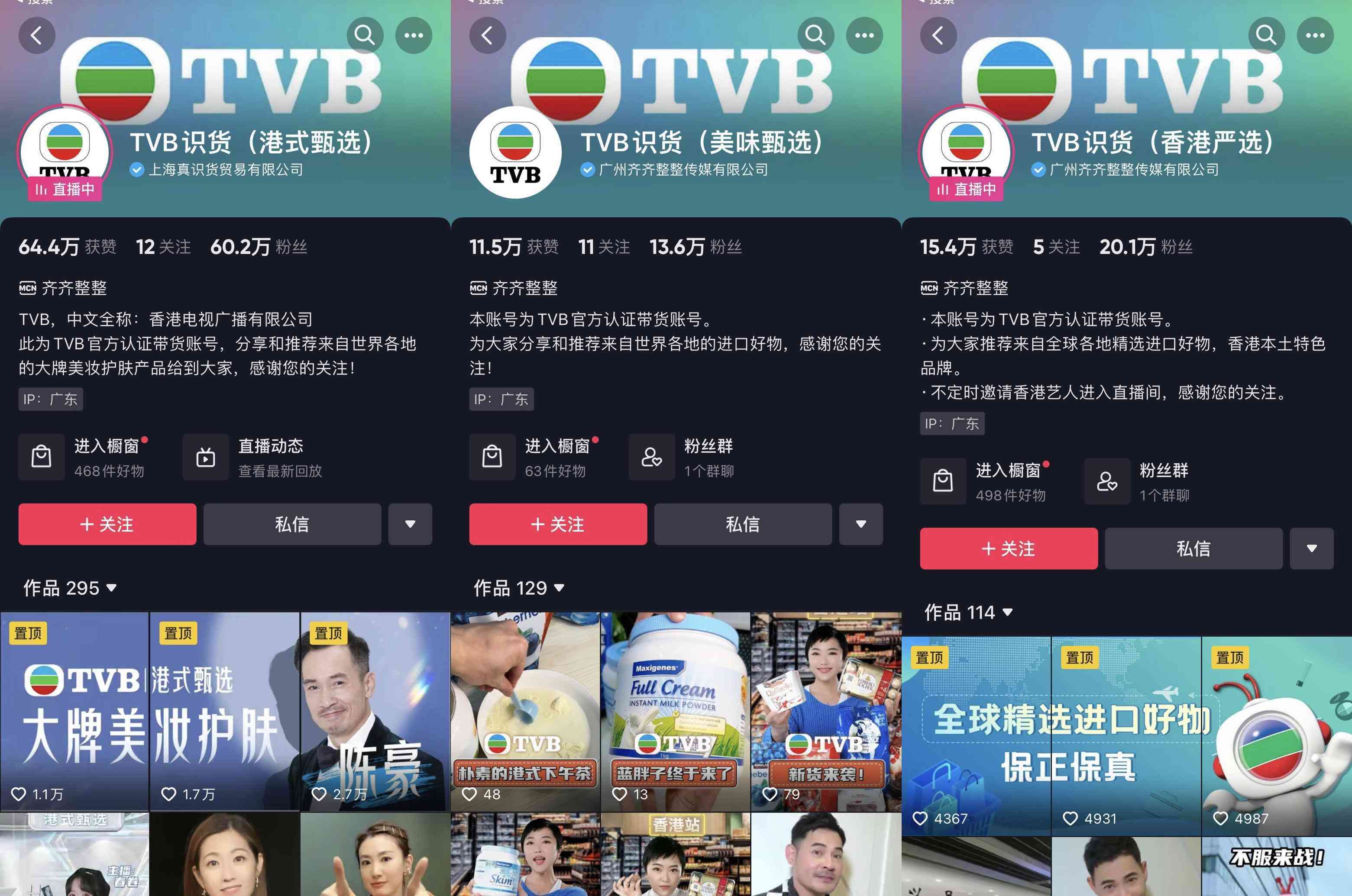 據(jù)了解,此次并非TVB首次試水直播帶貨行業(yè)。2022年4月,TVB入駐抖音直播,在官方賬號(hào)以外,開(kāi)通了3個(gè)直播帶貨賬號(hào),分別為TVB識(shí)貨(港式甄選)、TVB識(shí)貨(美味甄選)和TVB識(shí)貨(香港嚴(yán)選),由上海真識(shí)貨貿(mào)易有限公司和廣州齊齊整整傳媒有限公司運(yùn)營(yíng),累計(jì)粉絲量接近94萬(wàn)。