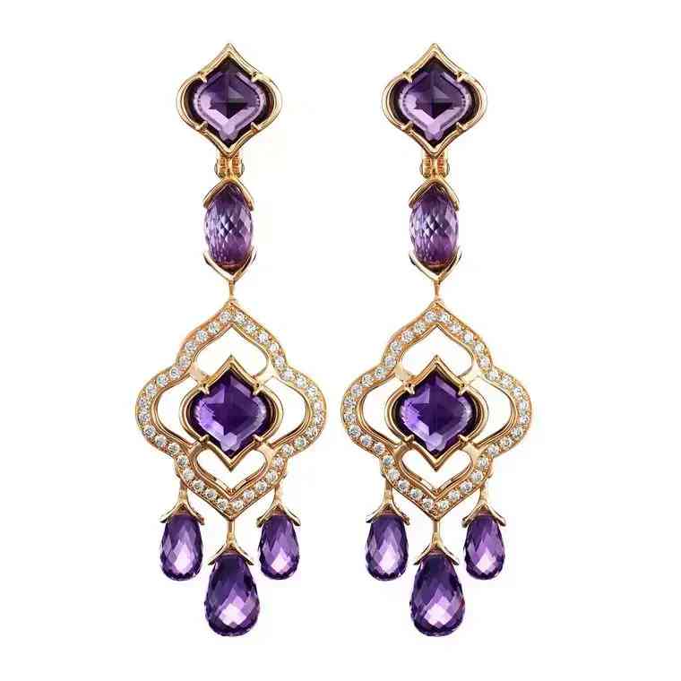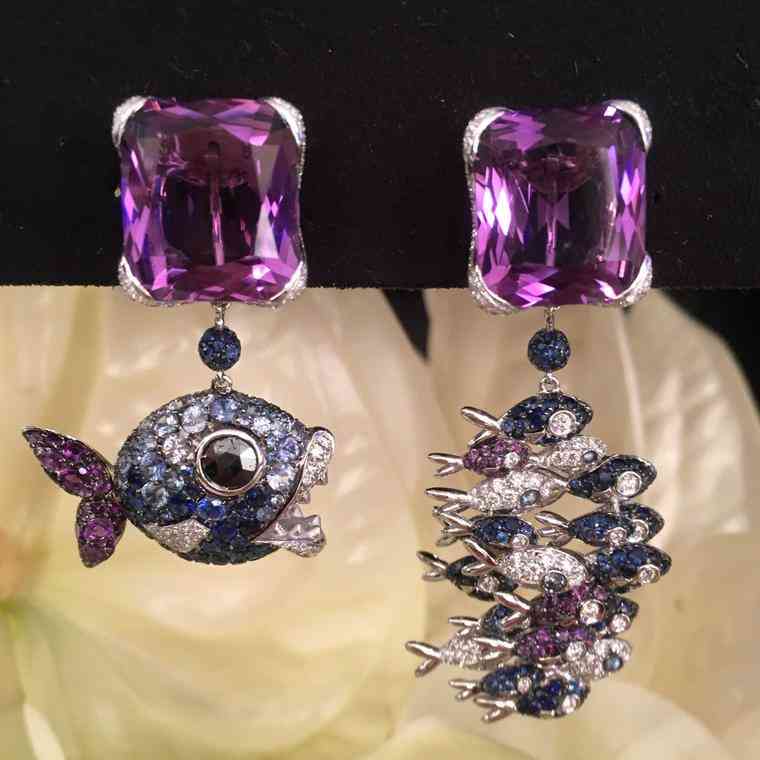 來自品牌de Grisogono的耳環(huán),鑲嵌紫水晶藍寶石和鉆石