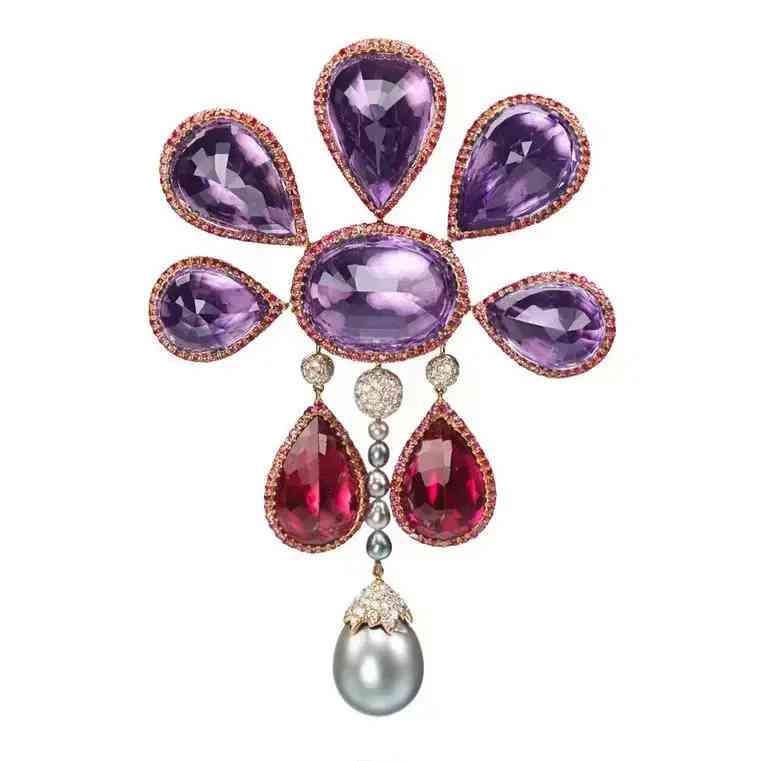 Suzanne Syz計的胸針,使用寶石為紫水晶、紅碧璽、尖晶、珍珠