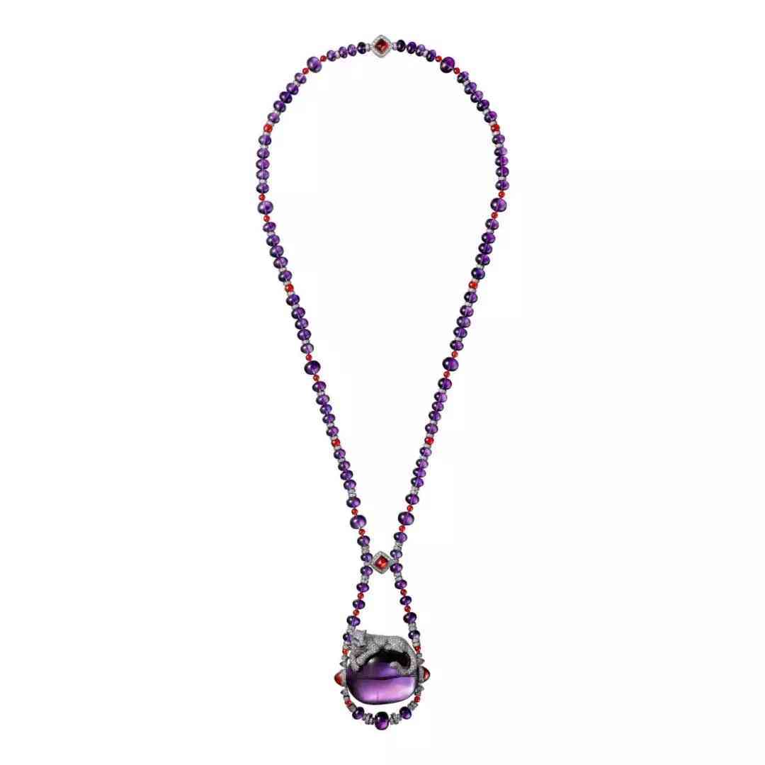 來自卡地亞étourdissant 系列,吊墜為174.52克拉紫水晶,另使用火歐泊、祖母綠、縞瑪瑙和鉆石