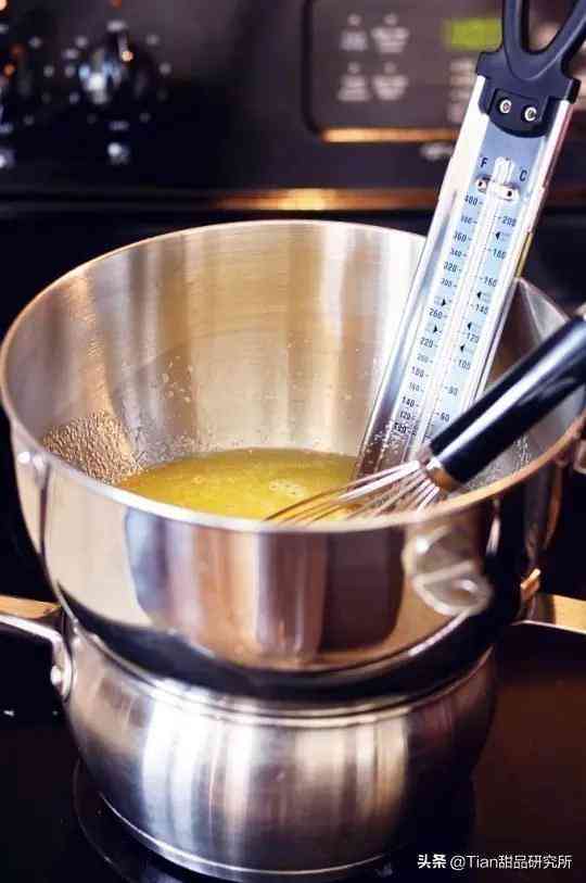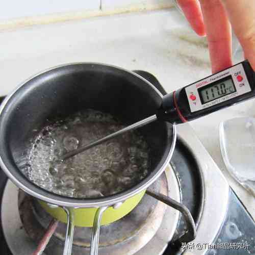 1、將水33g、白砂糖73g放入小鍋中,小火熬煮,溫度計(jì)設(shè)定為118度