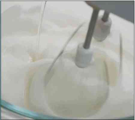 3、糖水達(dá)到118度時(shí),細(xì)線倒入蛋清中,繼續(xù)打發(fā)蛋清至盆壁溫度降為手溫