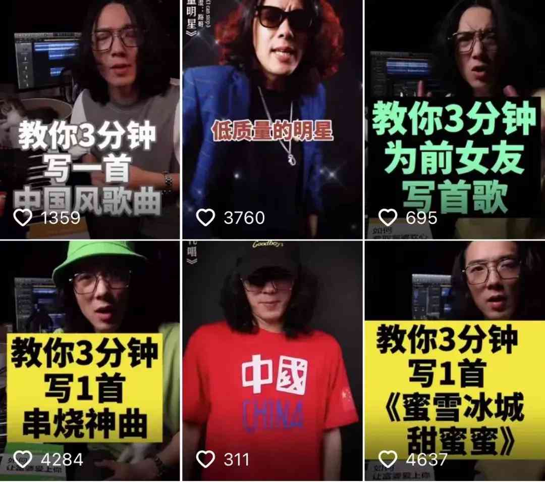 在他的抖音首頁(yè),標(biāo)題大多以亮色加粗,或亮色背景的形式出現(xiàn)在視頻封面,“3分鐘”是系列視頻里一定會(huì)出現(xiàn)的關(guān)鍵詞——教你3分鐘寫(xiě)一首校園歌曲、教你3分鐘寫(xiě)一首串燒歌曲、教你3分鐘寫(xiě)一首《蜜雪冰城甜蜜蜜》——清楚直接,符合抖音受眾的觀看習(xí)慣。