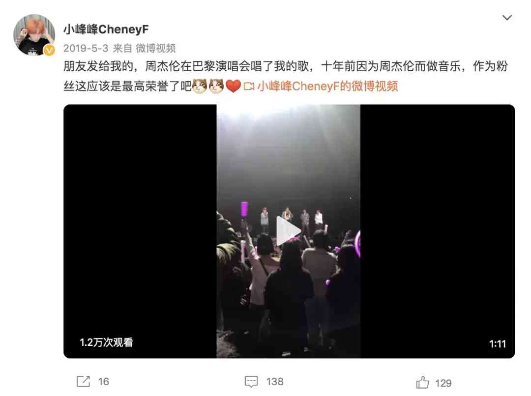 2019年,陳峰轉(zhuǎn)發(fā)周杰倫在巴黎演唱會(huì)上唱《學(xué)貓叫》的視頻