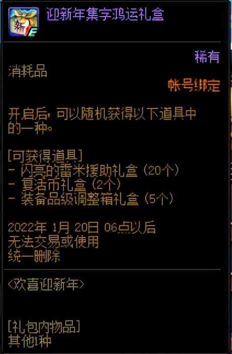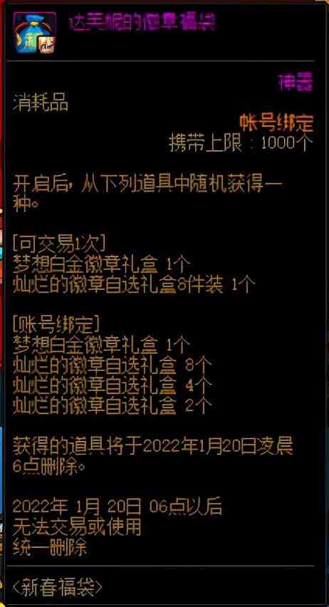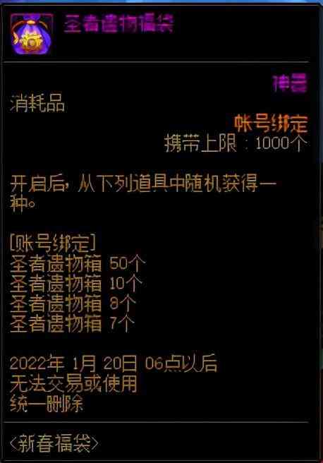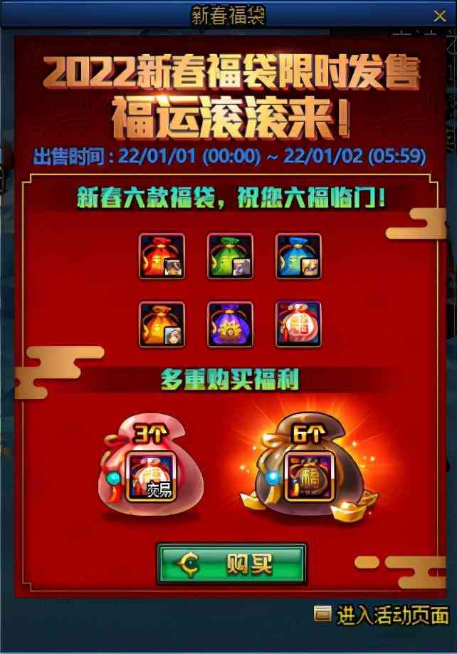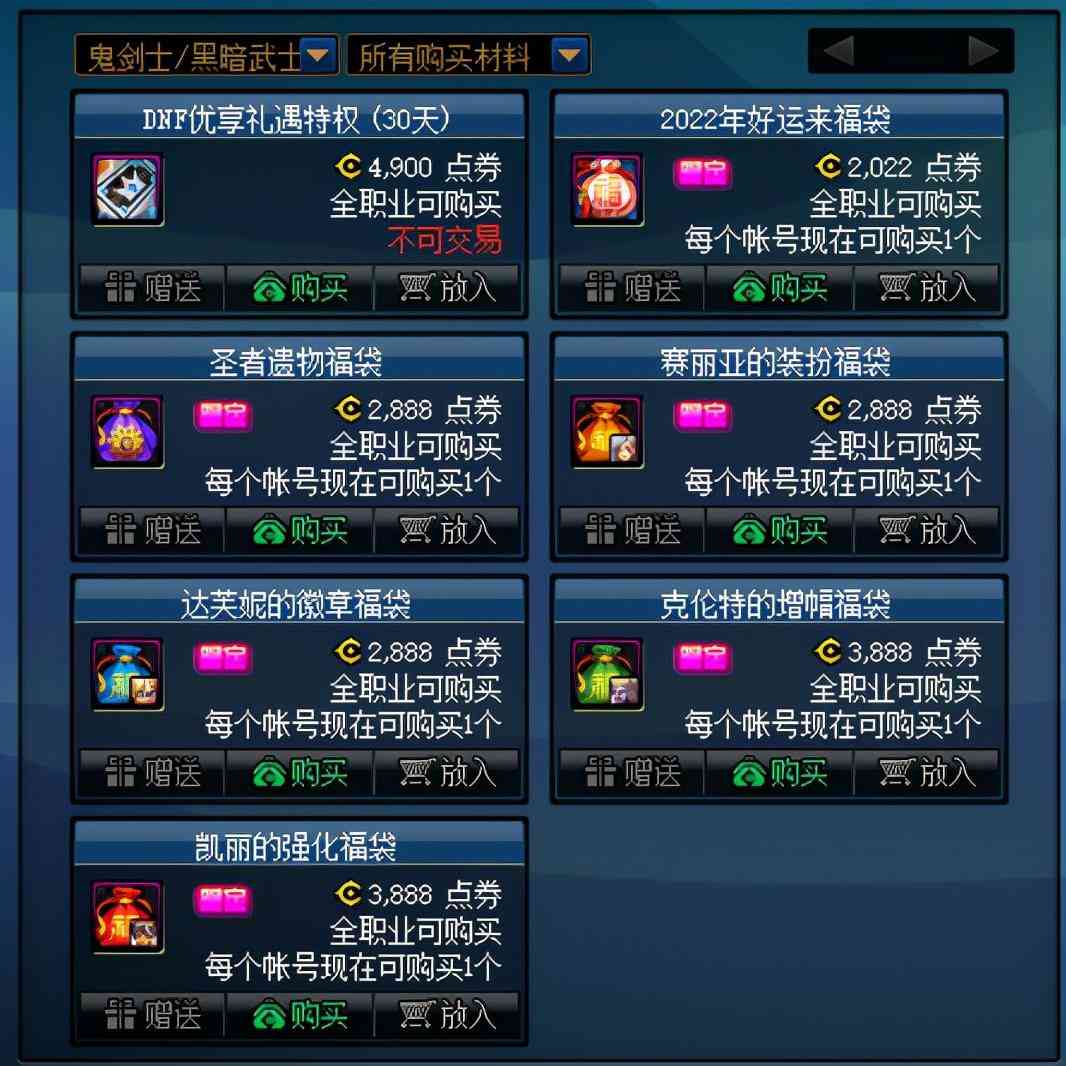 福袋一共五種,每種福袋只能購買一次,分別為圣者遺物、裝扮、徽章、增幅和強(qiáng)化福袋,售價(jià)統(tǒng)一為2888點(diǎn)券。另外還有好運(yùn)來福袋,售價(jià)2022點(diǎn)券,可開出上述五種福袋中的一種。