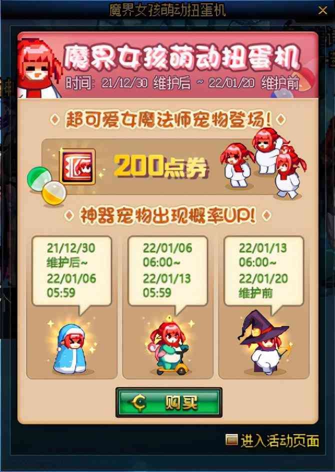 這個活動是一個商城活動,我們可花費(fèi)200點(diǎn)券購買一張扭蛋券抽取魔界人寵物,寵物外觀和當(dāng)前正在進(jìn)行的魔法家園一致。