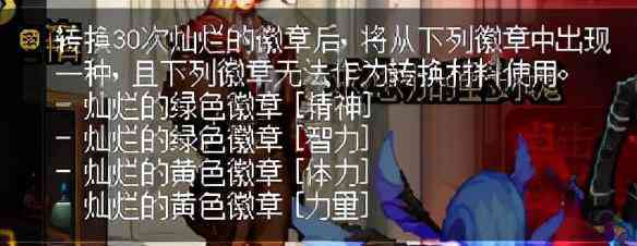 活動可以把白金徽章、燦爛徽章更換成其他徽章,更換需要花費(fèi)一定數(shù)量金幣,燦爛徽章變換30次后,一定可獲得燦爛綠色精神、智力或者燦爛黃色體力、力量徽章。