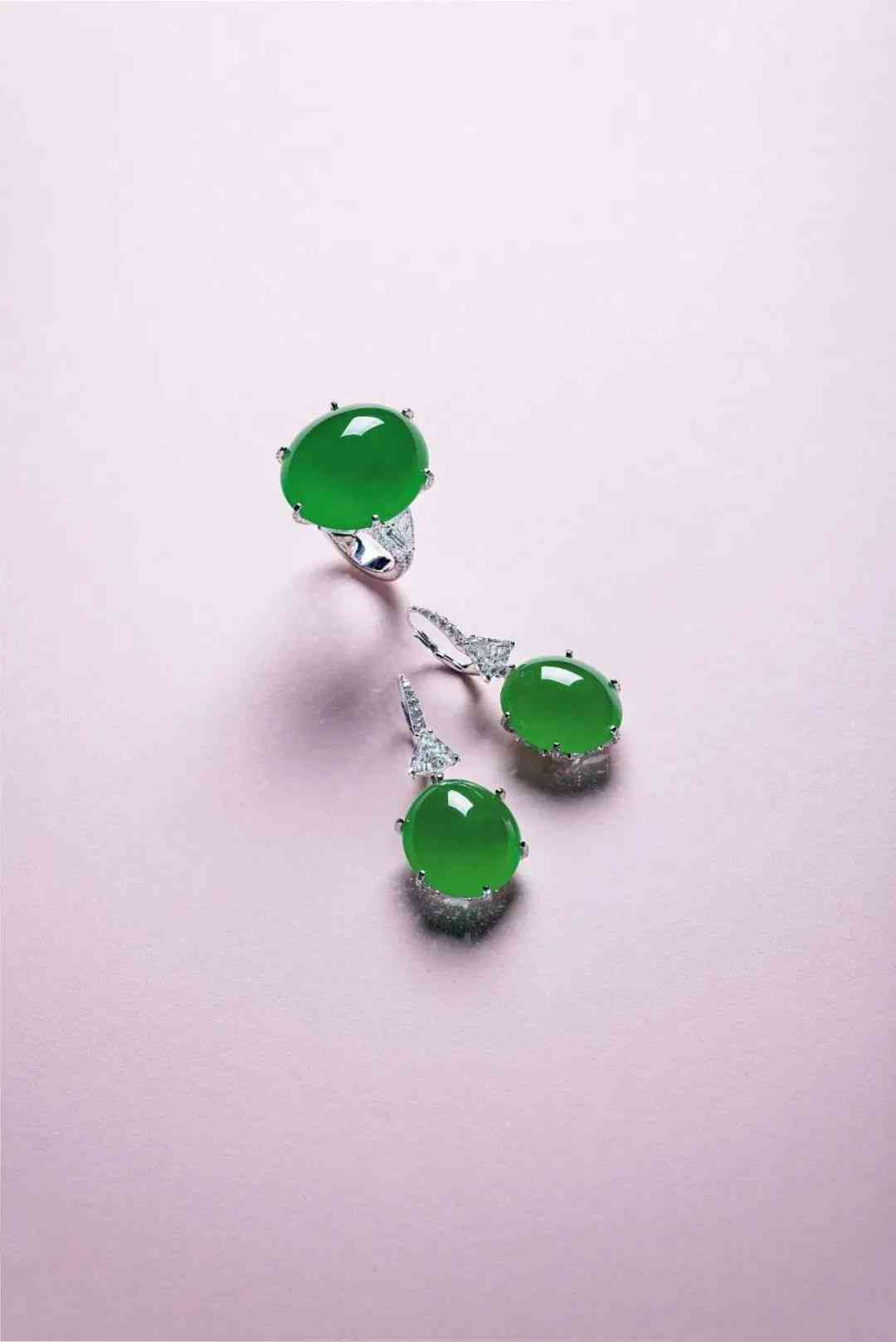還有這套蛋面戒指和耳環(huán)也是絕對的精品,大家知道,蛋面翡翠的切割需要近乎完美的工藝及超高的耗材率,而這枚只蛋面戒指及耳環(huán)一對采用更為罕見的“雙蛋面”切割設(shè)計,讓每顆翡翠呈現(xiàn)圓潤完美的蛋形,戒指尺寸超過 22 毫米,切割比例優(yōu)美,弧面平滑豐滿,無論從任何角度,都能欣賞到其完美凝潤的翠色。