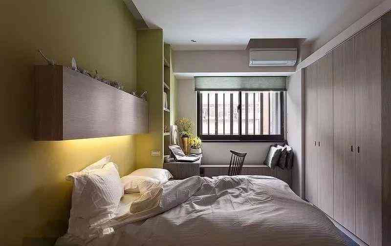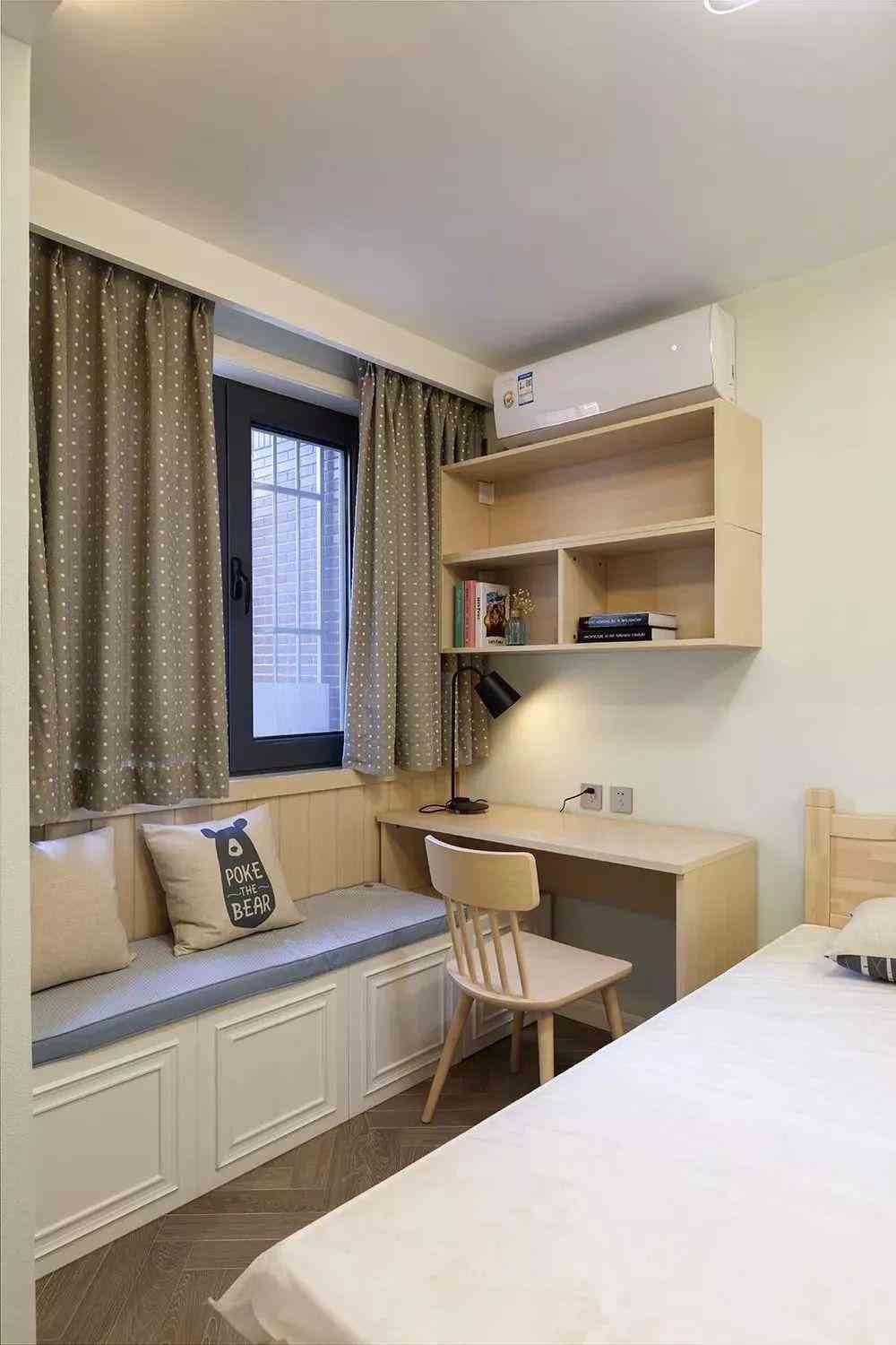 直接在飄窗上方架一個(gè)柜子,用來(lái)作為床頭柜、書(shū)桌,這樣的布局不會(huì)影響飄窗本身的收納和布置,非常實(shí)用。