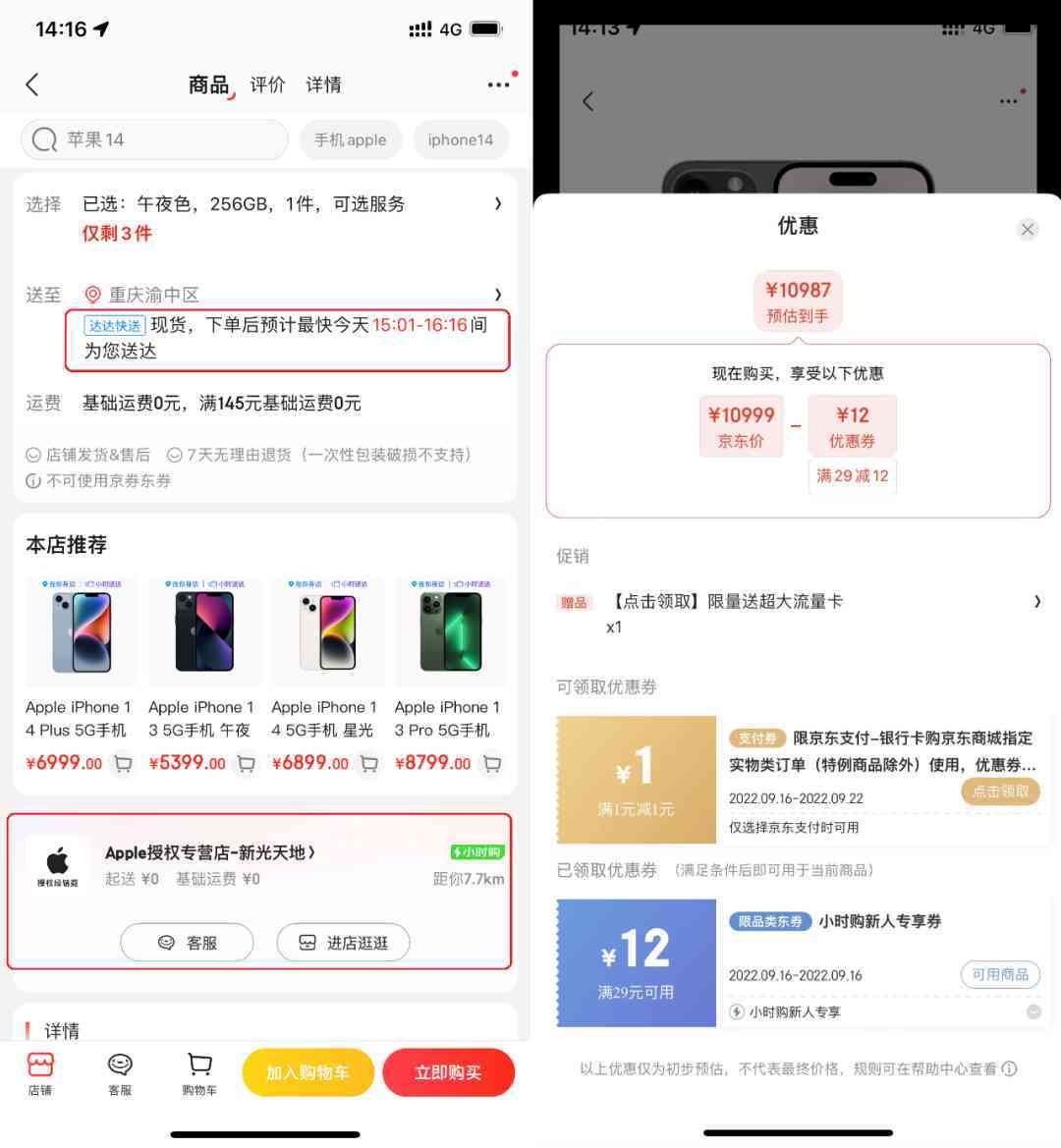 如果你所在城市的蘋果授權(quán)直營店/經(jīng)銷商已經(jīng)被“掃蕩一空”,退而求其次就只能選擇蘋果官網(wǎng)郵寄/Apple Store自提,以及天貓旗艦店和京東的自營店,但這僅限iPhone 14和iPhone 14 Plus,基本上下周就能到貨,在不加價的前提下,還算可以接受。