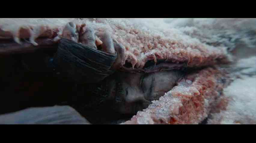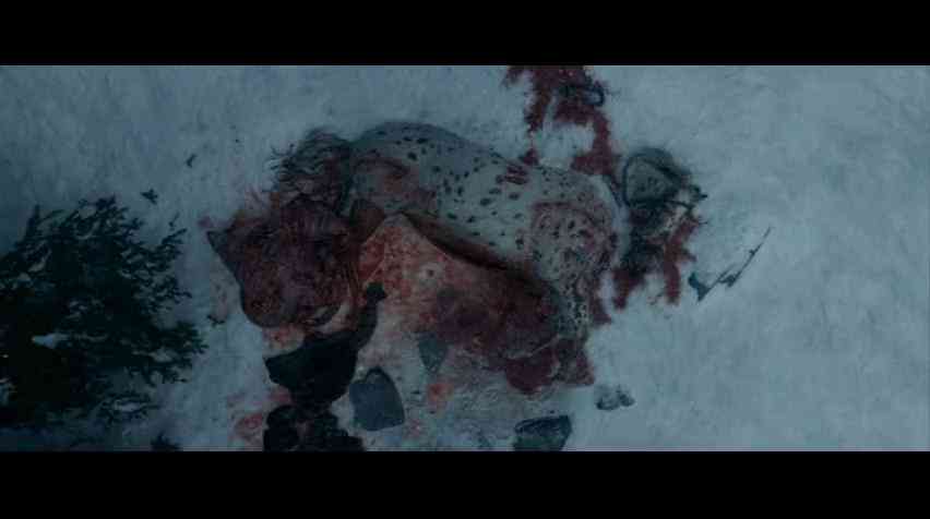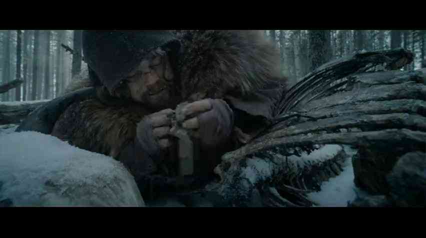 于是接下來的噩運,相比被熊蹂躪,幾乎可以慶幸到默念阿彌陀佛了。兒子被殺后,小李子徹底被見利忘義的反派一號遺棄在荒野上。為了求生,也為了復(fù)仇,這個男人真是做到了有什么吃什么的地步。比如遇到動物的尸體,就敲骨吸髓;比如看到河水,就臨淵羨魚;比如和印第安人一起分享晚餐,茹毛飲血;再比如為了避寒,掏空了馬內(nèi)臟,馬革裹尸。