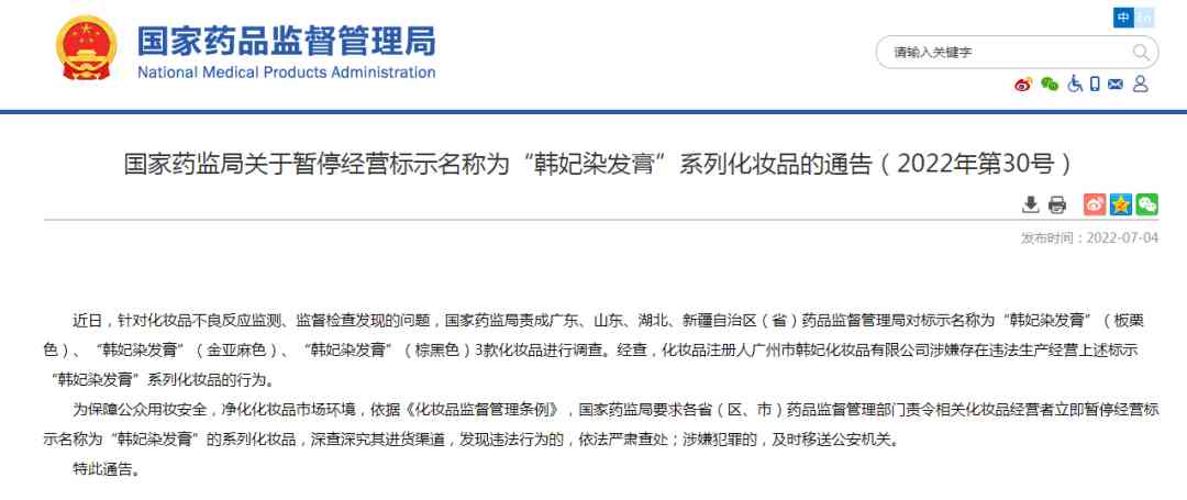 比如,產品標識名稱為“韓妃染發(fā)膏”系列化妝品多次被國家藥監(jiān)局點名批評,染發(fā)膏主體廣州市韓妃化妝品有限公司已被要求責令整改并立案調查。