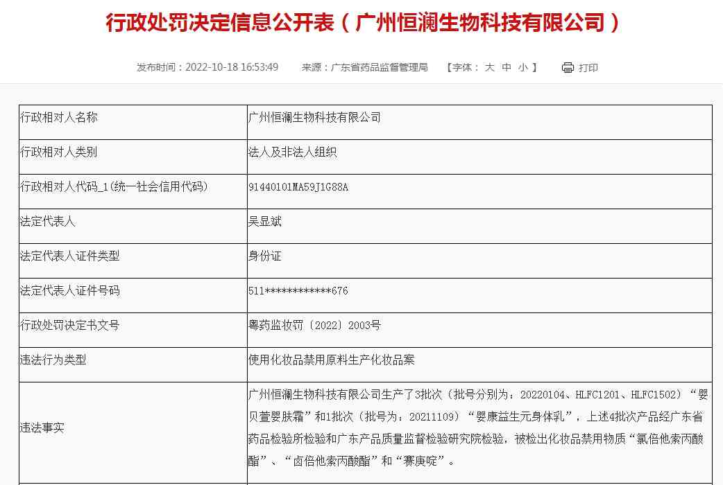 例如廣州恒瀾生物科技有限公司旗下兒童化妝品使用禁用原料“氯倍他索丙酸酯”、“鹵倍他索丙酸酯”和“賽庚啶”等,且金額較大,企業(yè)、法定代表人、生產負責人三方均被禁業(yè)處罰:10年內不予辦理該公司提出的化妝品備案和受理其提出的化妝品行政許可申請,企業(yè)法定代表人吳某某及生產負責人莫某某終身禁止從事化妝品生產經營活動。