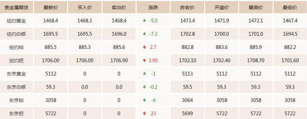 截止發(fā)稿,國(guó)際現(xiàn)貨黃金價(jià)格報(bào)1468.30美元/盎司,較昨日收盤(pán)價(jià)下跌3.10美元/盎司;國(guó)際現(xiàn)貨鈀金價(jià)格報(bào)1743.44美元/盎司,較昨日收盤(pán)價(jià)上漲4.25美元/盎司;國(guó)際現(xiàn)貨白銀價(jià)格報(bào)17.003美元/盎司,較昨日收盤(pán)價(jià)上漲0.026美元/盎司;國(guó)際現(xiàn)貨鉑金價(jià)格報(bào)884.19美元/盎司,較昨日收盤(pán)價(jià)上漲0.34美元/盎司。